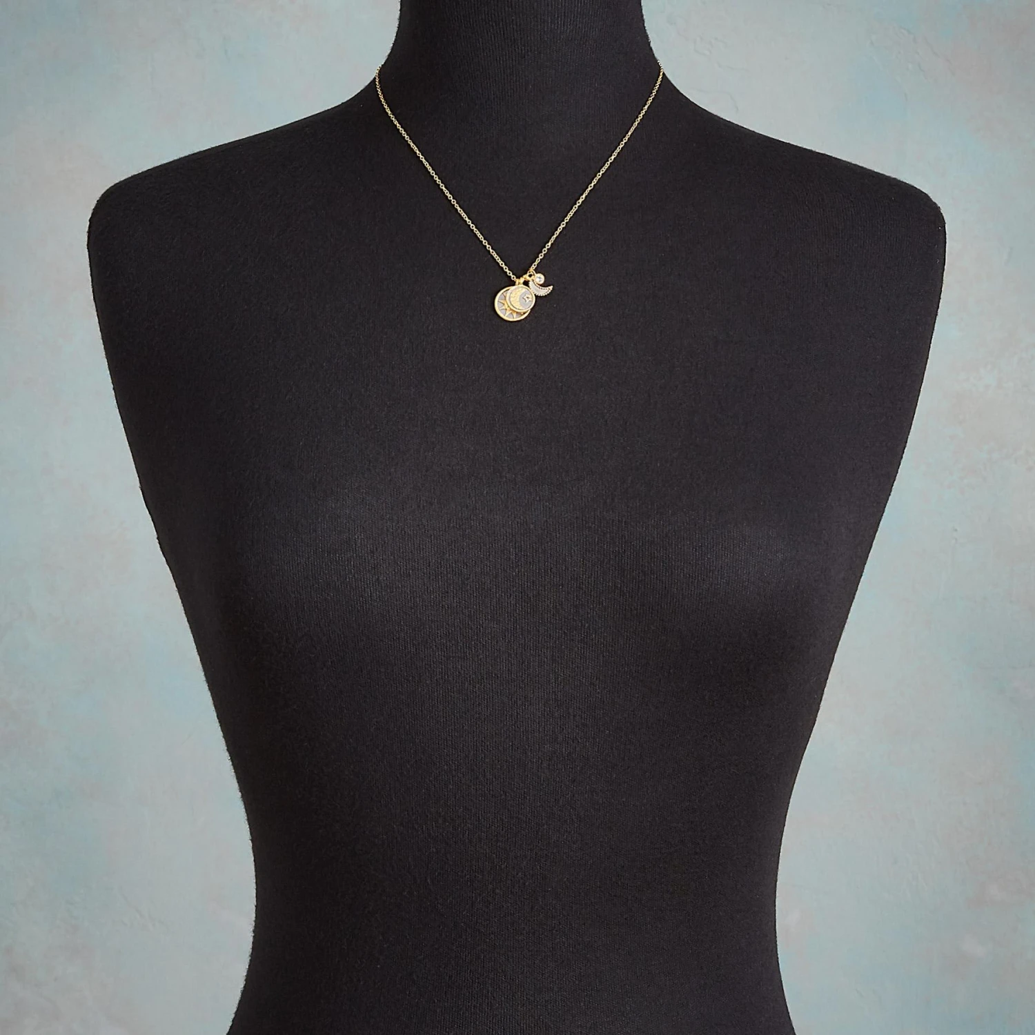 Give more than the world, give her the universe with a handcrafted 18kt gold plated necklace shining with heavenly charms and the sparkle of faceted white topaz. Spring ring clasp. Exclusive. 18″L.