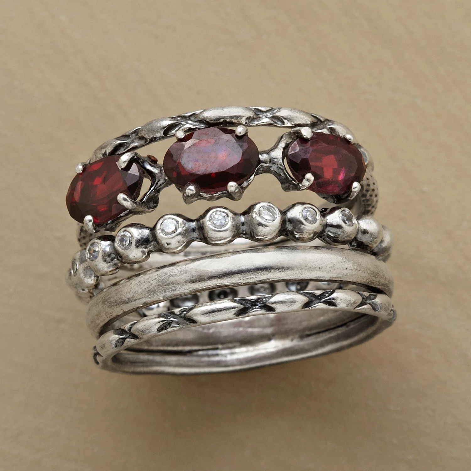 This red garnets band ring joins five sterling silver bands in back, one set with three passionate garnets, another with an arc of pinprick diamonds. A hand-cast exclusive in whole sizes 5 to 9. Tapers 1/2″ to 3/8″W. Â