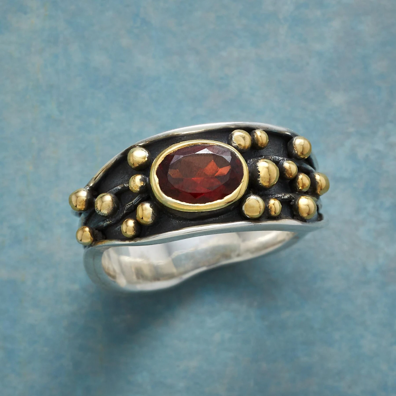 Faceted garnet remains true to its hue amid golden beads scattered unpredictably across a ridged, wavy band. Exclusive. Oxidized sterling silver; 14kt gold pen-plated beads and bezel. Whole sizes 5-10.