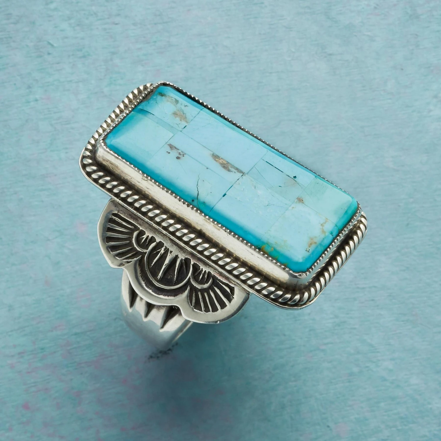 To create this heirloom-quality mosaic ring, Benny and Valerie Aldrich cut, shape and precisely fit vibrant turquoise tiles and frame them in a handcrafted sterling silver setting. Exclusive. Whole sizes 5-9.