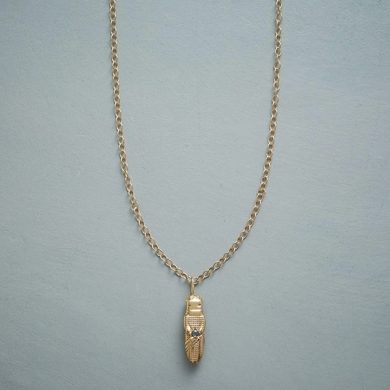 Whisper your worries and let this tiny “worry doll” whisk them away. B’atz represents the Mayan spirit of destiny, its hands holding a gleaming alexandrite. Handmade of 14kt gold; spring ring clasp. 20″L.
