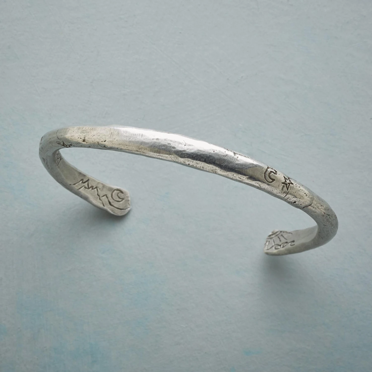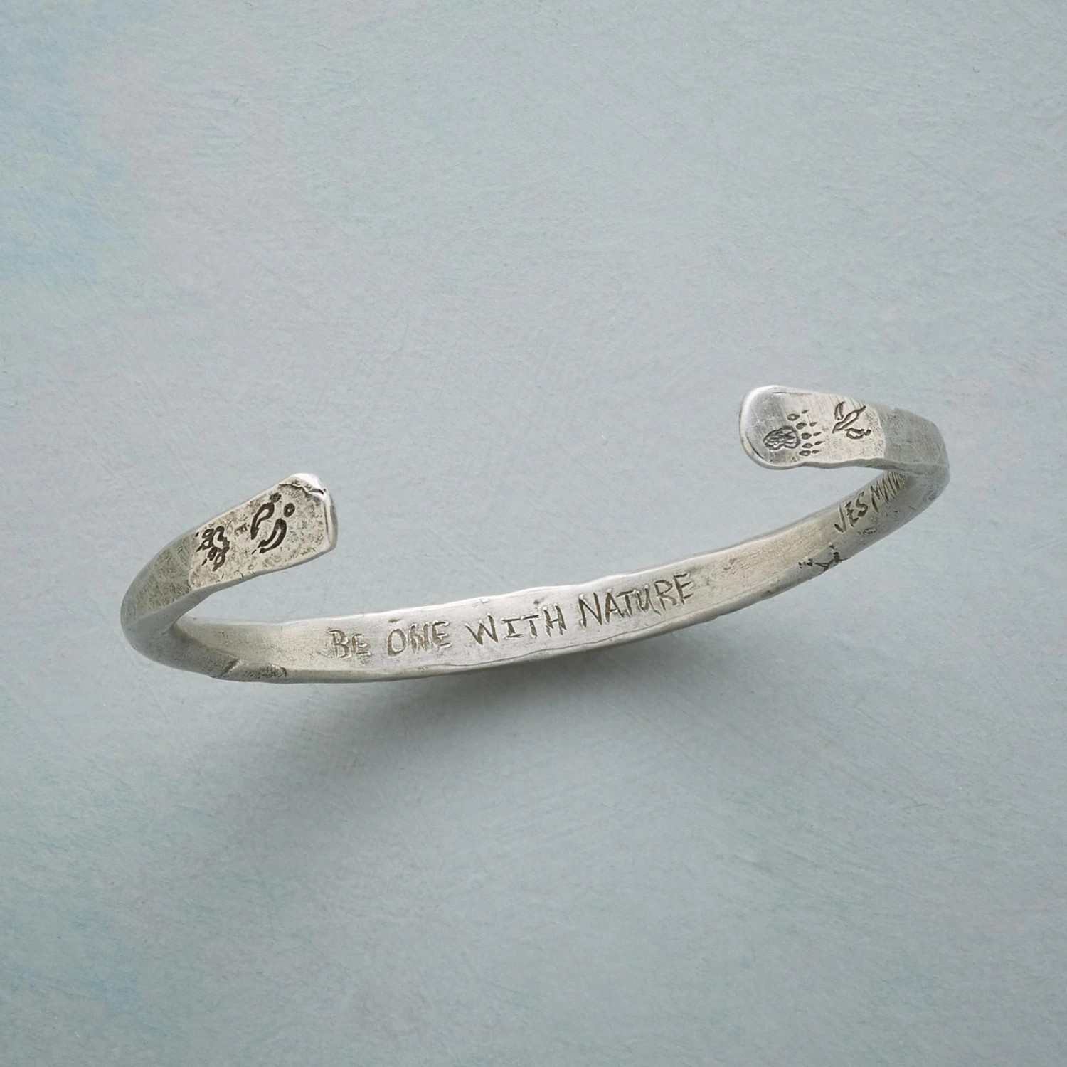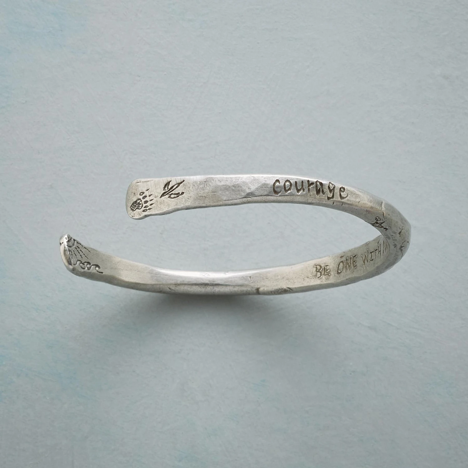 Jes MaHarry inscribes our weighty, hand-hammered pewter cuff bracelet with moons, stars, mountains and the inspiring words “be one with nature” and “courage.” Handmade in USA, Exclusive. 2-5/8″ dia.