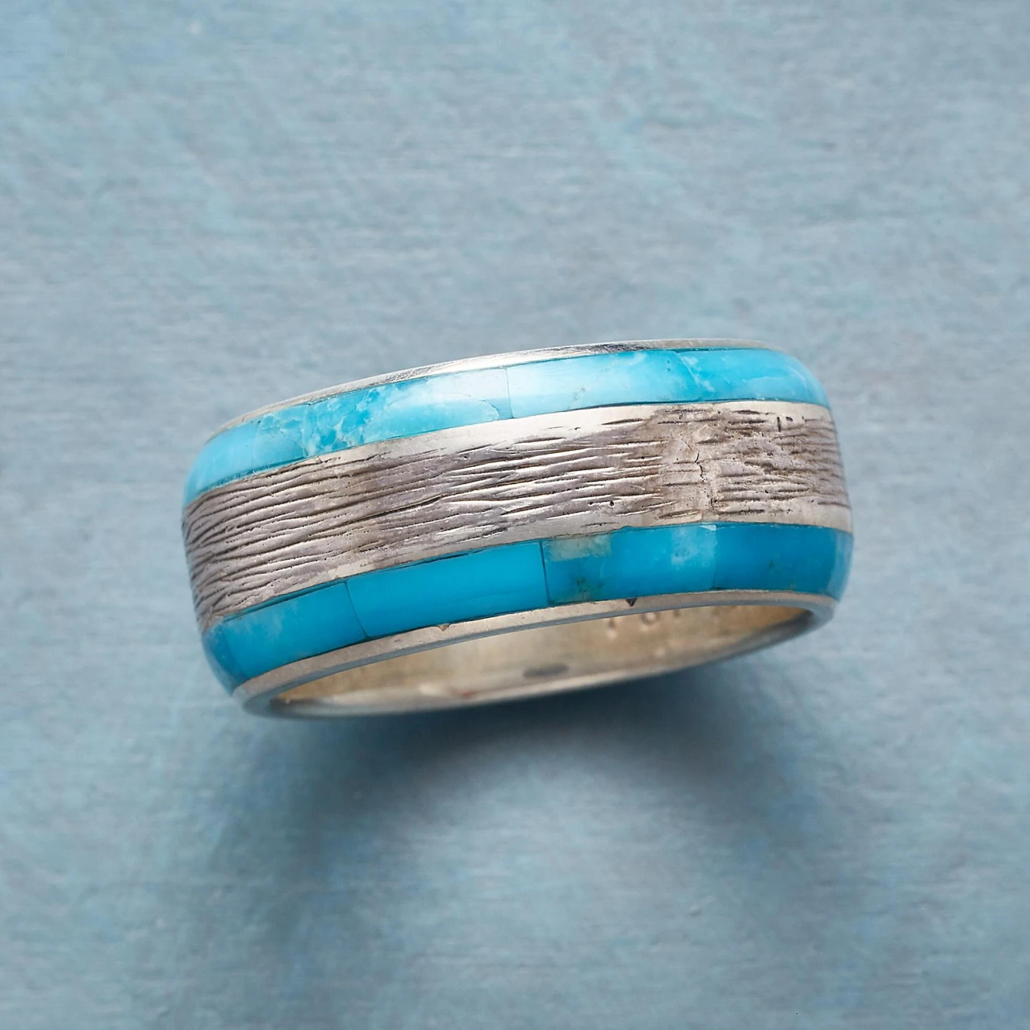 Kingman turquoise channels its infinite blues as it runs alongside hand-etched sterling silver in this ruggedly handsome band. Exclusive. Whole sizes 9 to 12.