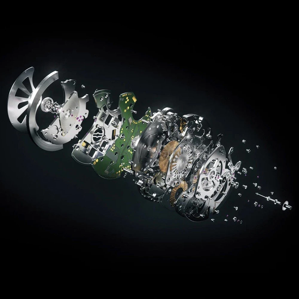 Behind the smoke grey skeleton dial with signature green Accutron accents, lies the world famous Accutron Electrostatic Movement. The energy created by twin turbines that rotate through the wearer’s motions, is stored in an accumulator which powers two motors; an electrostatic motor operating the fluid second hand and a step motor for the hour and minute hands. The second hand automatically stops at 12 o’clock after 5 minutes of non activity for power saving. While in power save mode, the watch continues to keep time: the hour and minute hand keep moving.
