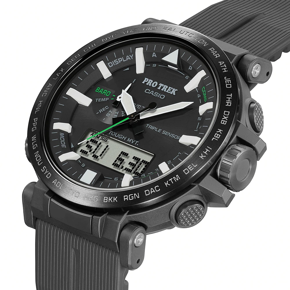 Climber line: Made with biomass plastics: Big, open face for an easy read. We are proud to announce watches employing biomass materials in the case, case back, and band to our Climber Line, which shines in a broad range of outdoor settings. Presenting a big, open face with striking oversized index marks, the watch radiates meticulous attention to textural appeal and design as well as functionality. A great companion for the outdoors and daily use alike.