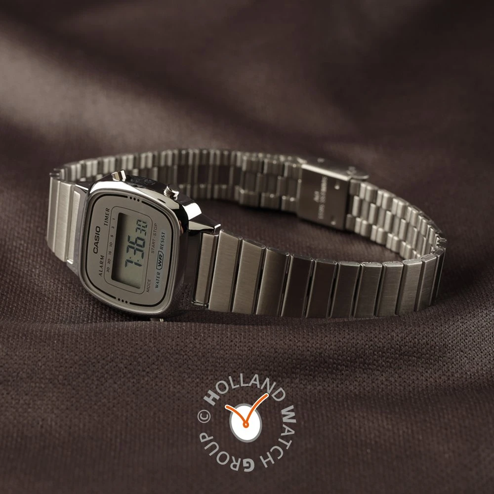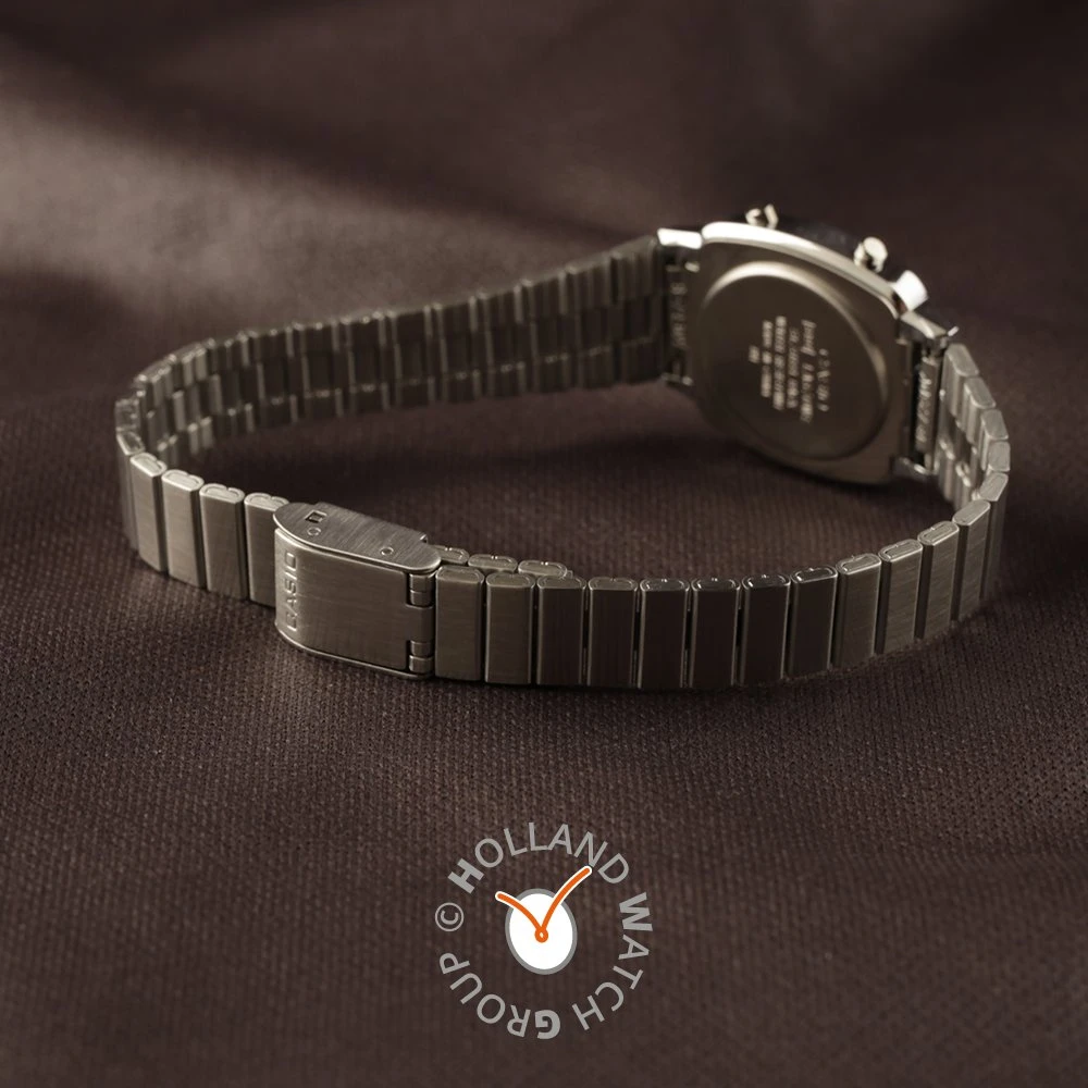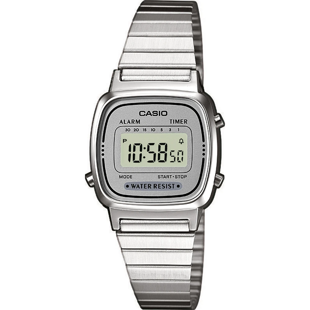This Casio watch has a case made of plastic with a diameter of 24.6 mm and is fitted with a metal band. Inside the case lies a Casio movement and the watch features a Mineral crystal.