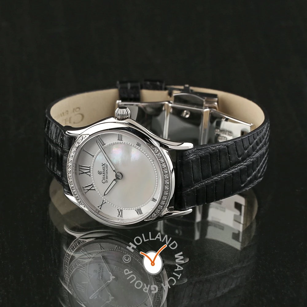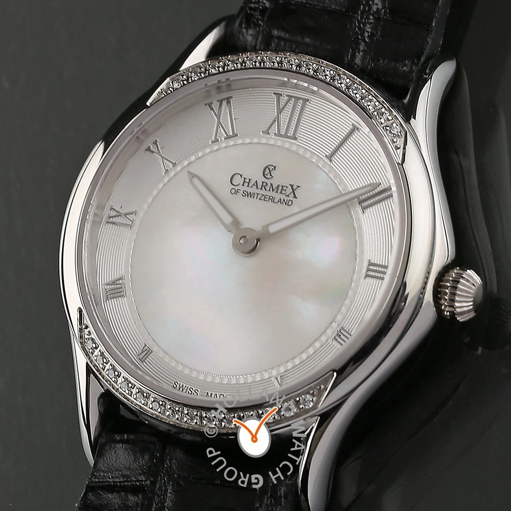 This Charmex of Switzerland watch has a case made of stainless steel with a diameter of 30 mm and is fitted with a leather band. Inside the case lies a Ronda movement and the watch features a Sapphire crystal.