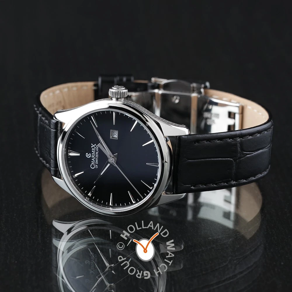 This Charmex of Switzerland watch has a case made of stainless steel with a diameter of 32 mm and is fitted with a leather band. Inside the case lies a Ronda movement and the watch features a Sapphire crystal.