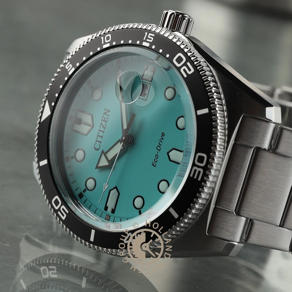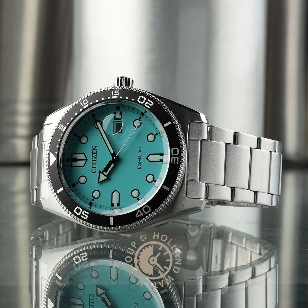 This solar diver features a stunning turquoise dial and a date bubble. Its fresh color and 10 ATM water resistance make it the perfect summer vacation companion.