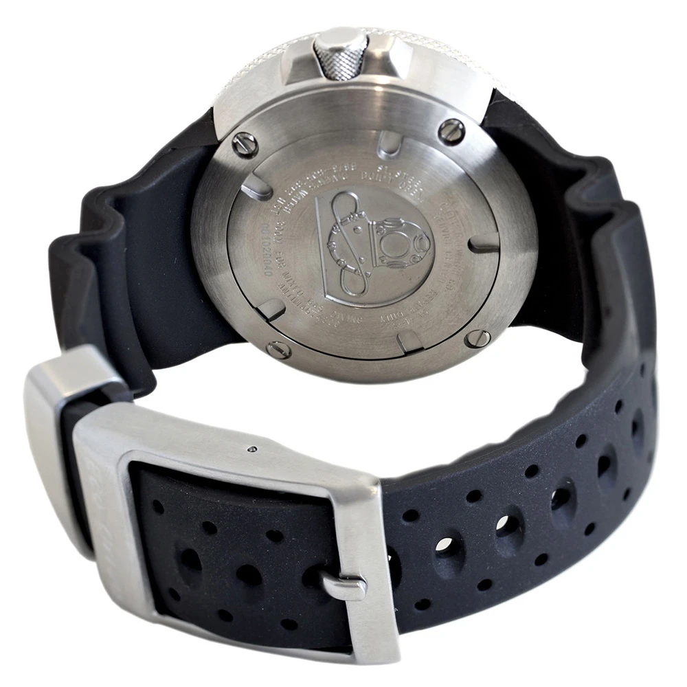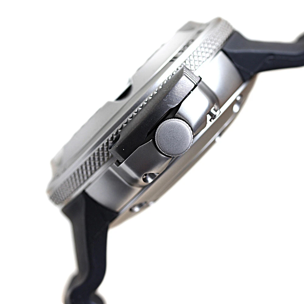 This Citizen watch has a case made of stainless steel with a diameter of 48 mm and is fitted with a rubber band. Inside the case lies a Citizen movement and the watch features a Mineral crystal.
