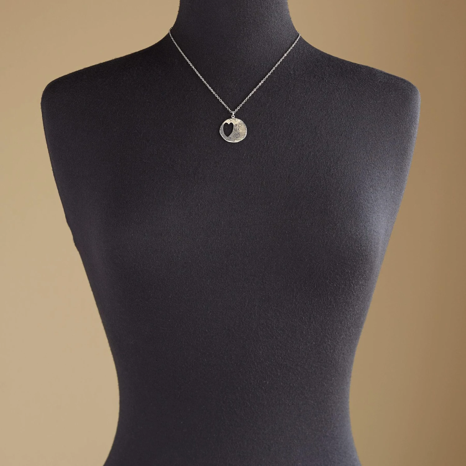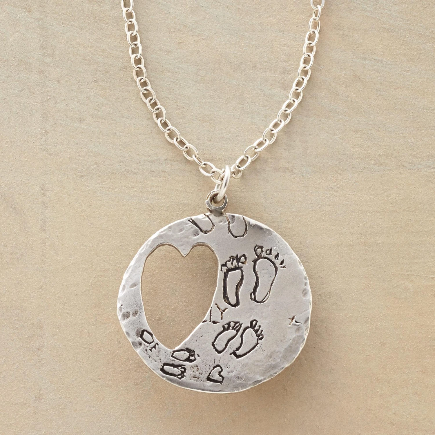 In a sterling silver symbol of motherly love, footprints grow as they round a cutout heart. Lobster clasp. Exclusive. Handcrafted in USA. 17″L.