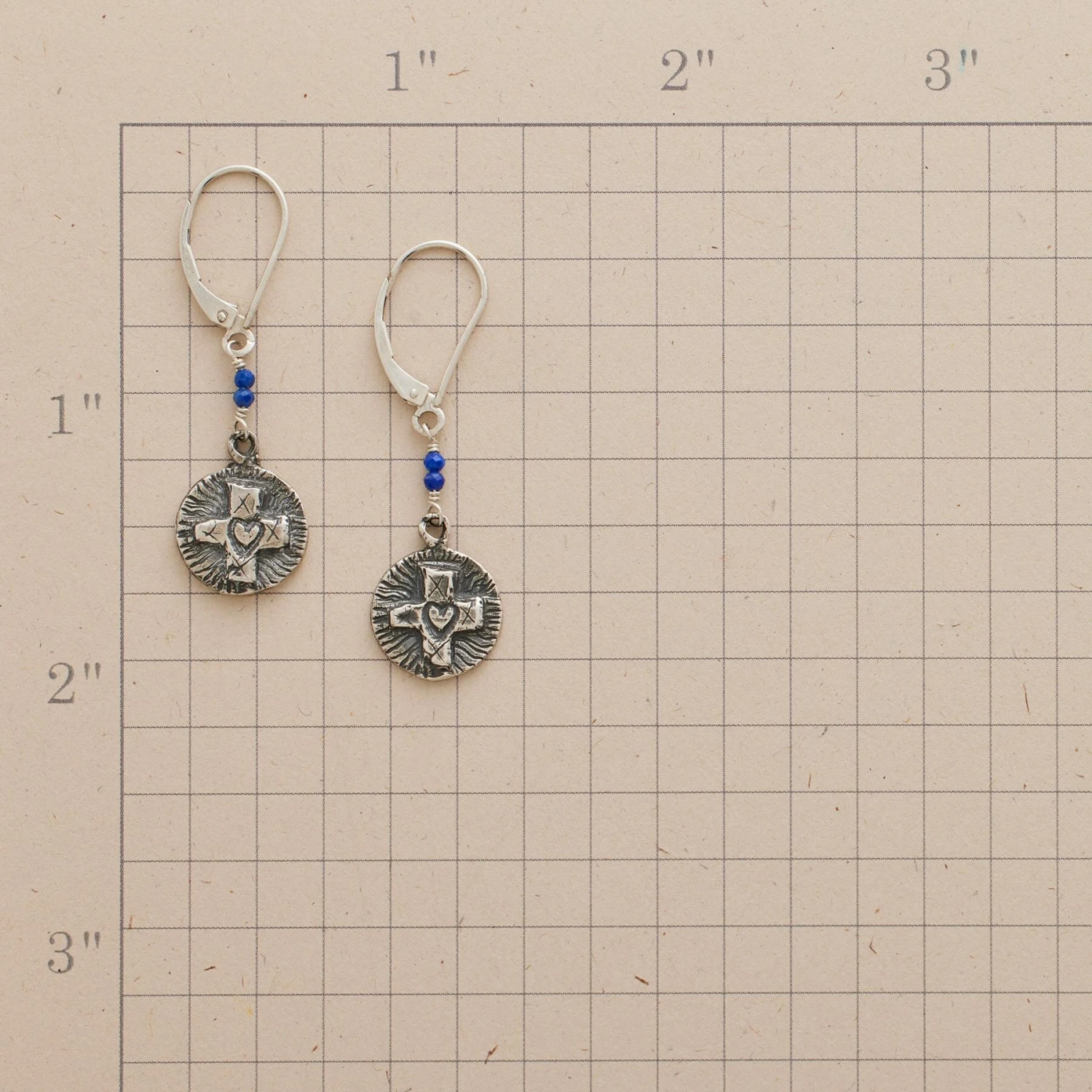 A bas-relief cross centered on a heart hangs below midnight blue lapis as a reminder that faith and love prevail through dark of night. “Have faith” on reverse. Exclusive. Handmade in USA by Jes MaHarry. Sterling silver. French wires. 1-5/8″L.