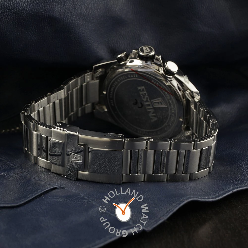 This Festina watch has a case made of stainless steel with a diameter of 45 mm and is fitted with a metal band. Inside the case lies a Miyota movement and the watch features a Mineral crystal.