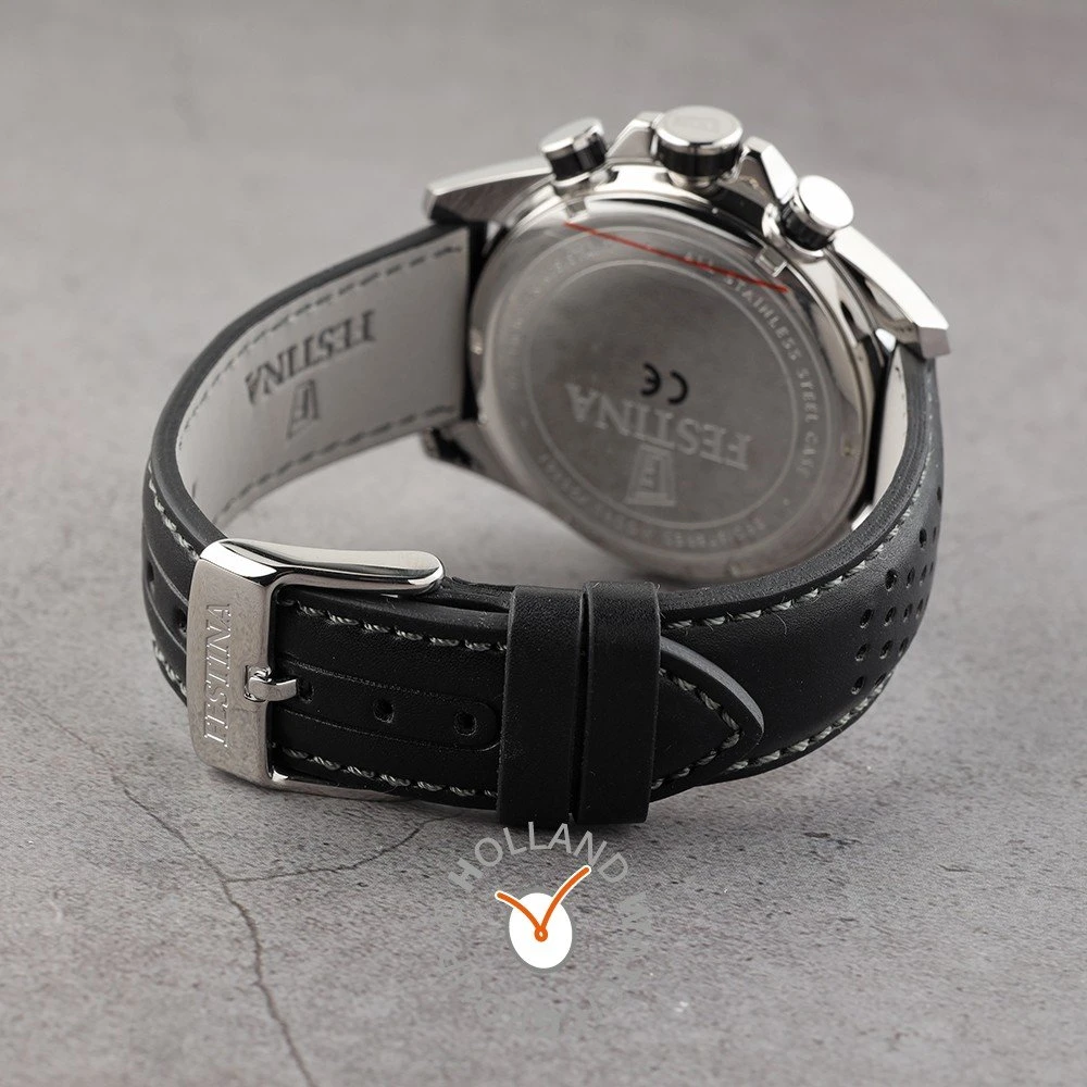 This Festina watch has a case made of stainless steel with a diameter of 45 mm and is fitted with a leather band. Inside the case lies a Miyota movement and the watch features a Mineral crystal.