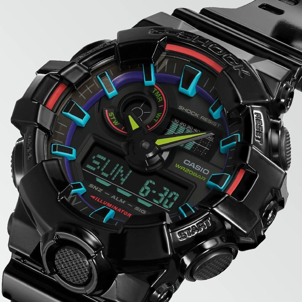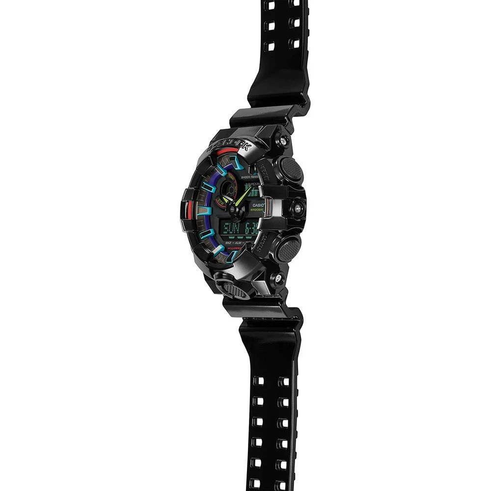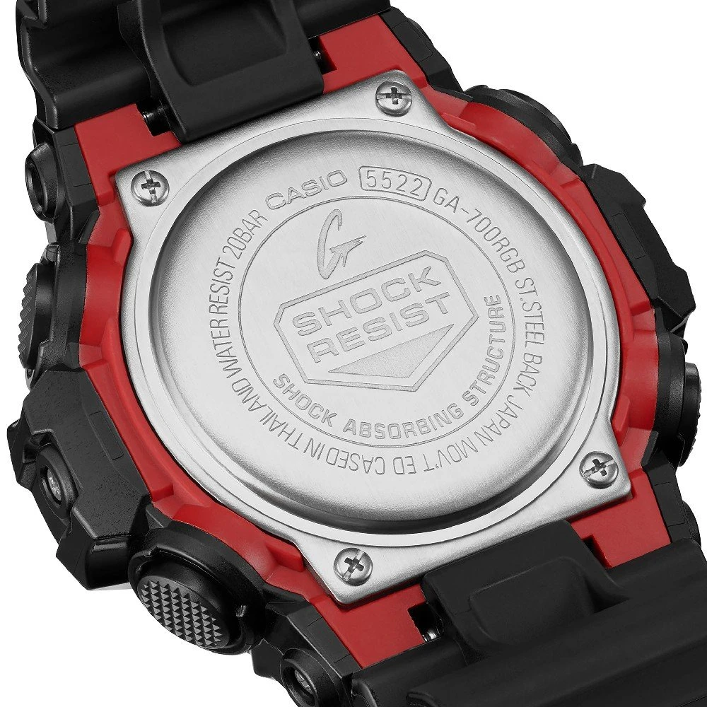 This G-Shock watch has a plastic case 53.4 mm in diameter and is fitted with a plastic / resin strap. Inside the case lies a Casio movement and the watch features a Mineral crystal.