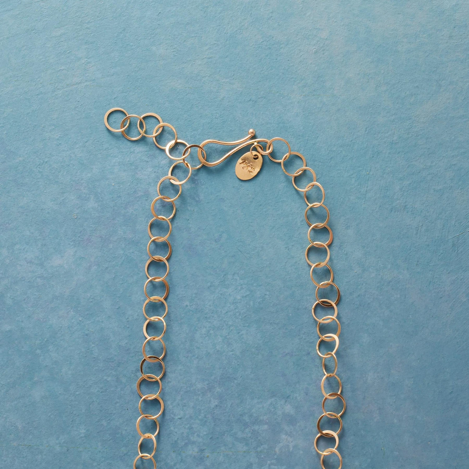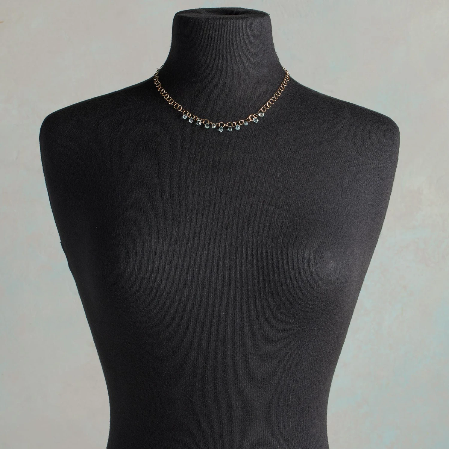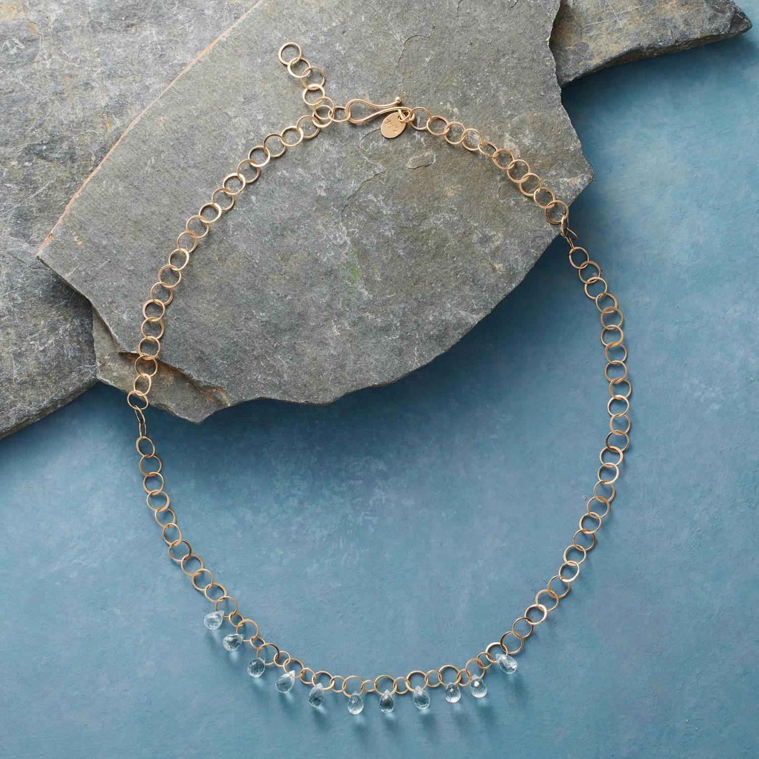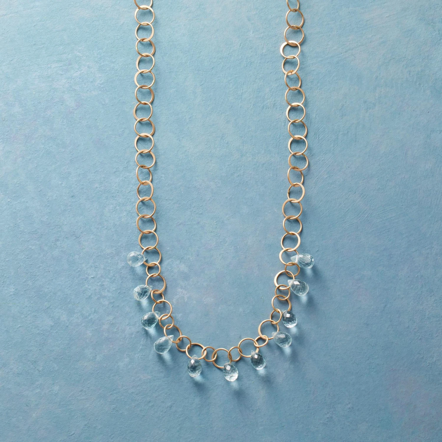 Intricately faceted teardrops of crystalline blue aquamarine cling to a 14kt gold necklace. Each slender circular link and every single teardrop handmade by Melissa Joy Manning. 14kt gold hook-and-eye closure. Made in USA. 18″L.
