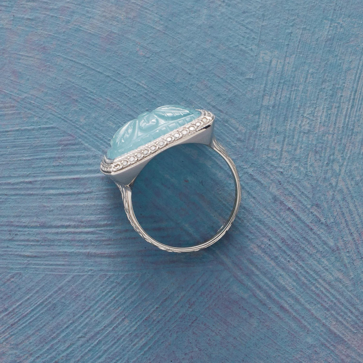 Exuding romance, inviting admiration. This one-of-a-kind carved aquamarine ring is set with brilliant white diamonds on a rectangular 14kt white gold band. Handmade by Julie Romanenko in the USA. Size 6. Setting 3/4″ x 1/2″.