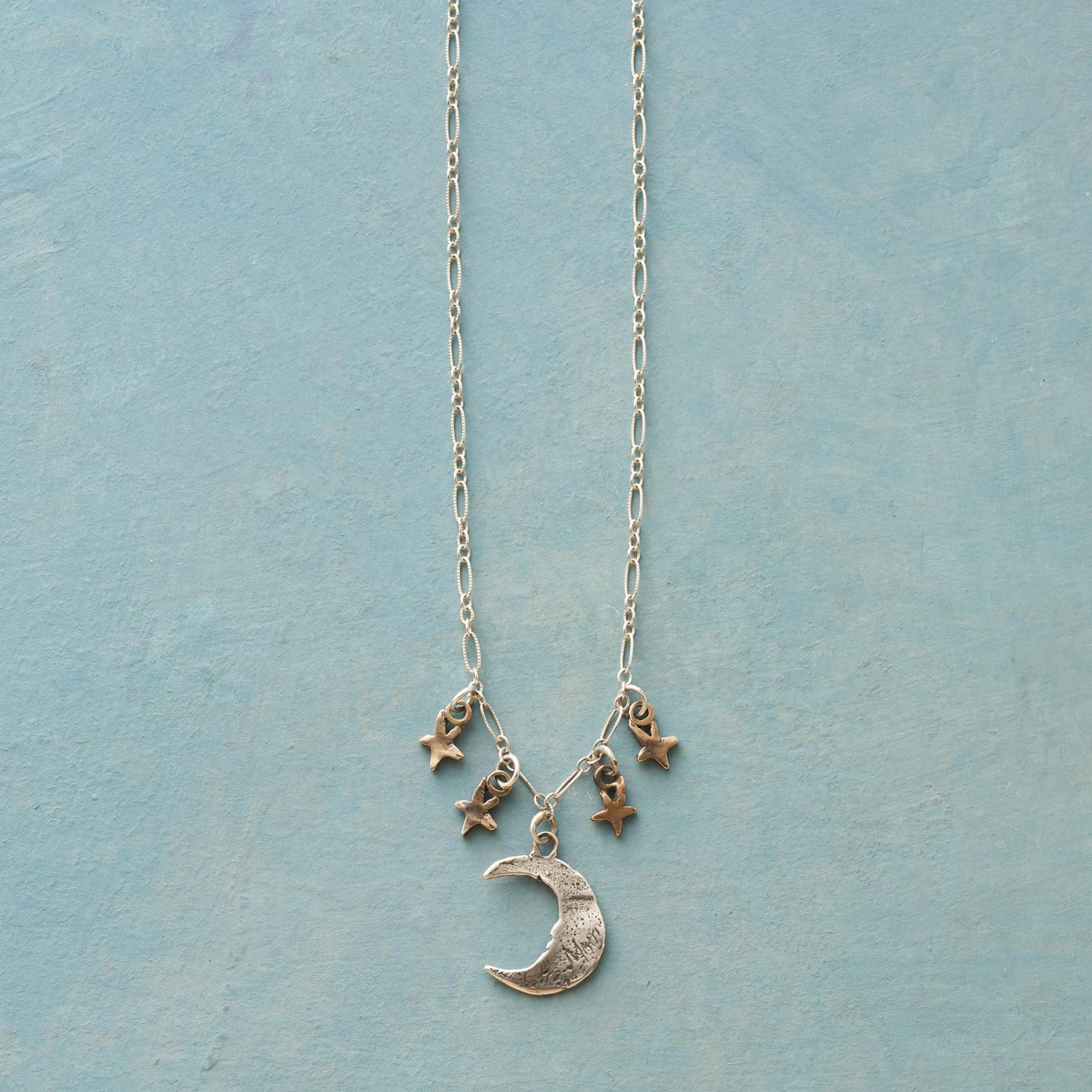 Above a sterling silver man in the moon, four 14kt gold stars represent the Southern Cross, a constellation long used to guide the way. By Jes MaHarry, handmade in USA. Exclusive. 18″l; 5/8″ dia.