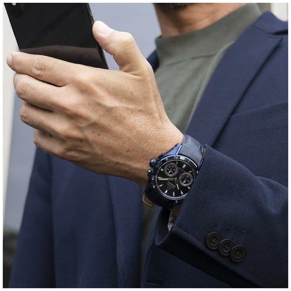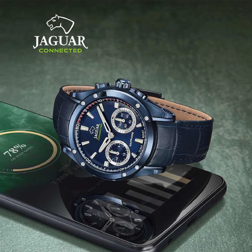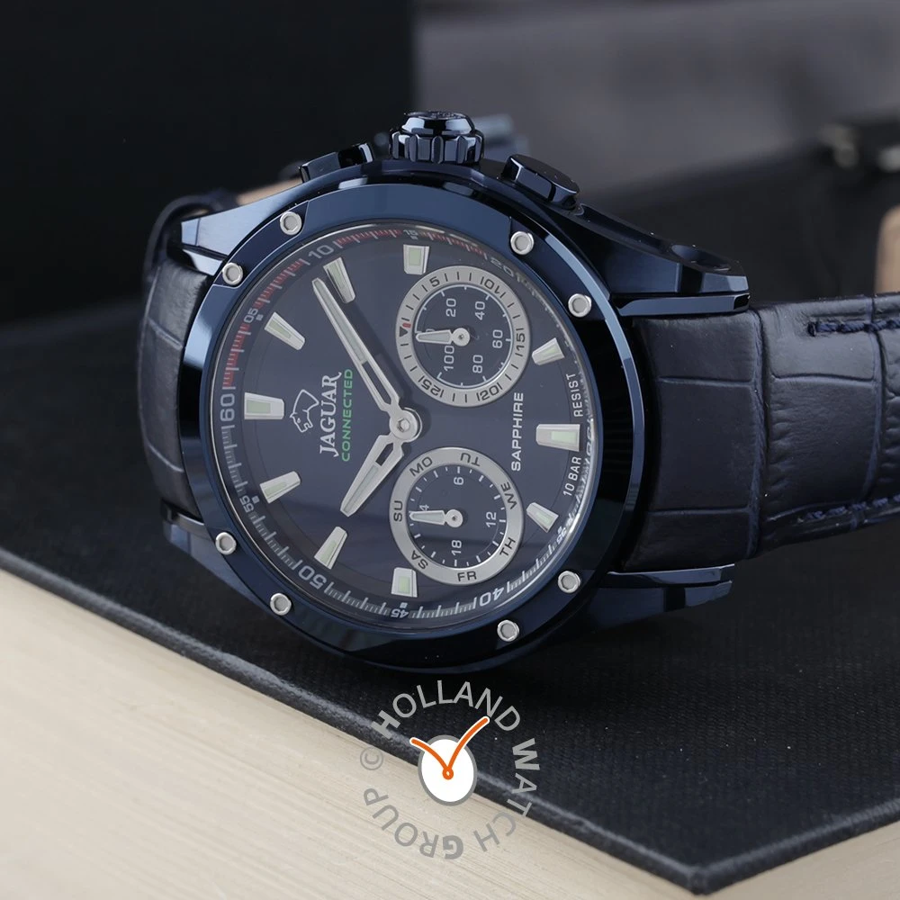 This Jaguar watch has a case made of stainless steel with a diameter of 45 mm and is fitted with a leather band. Inside the case lies a Kronaby movement and the watch features a Sapphire crystal.