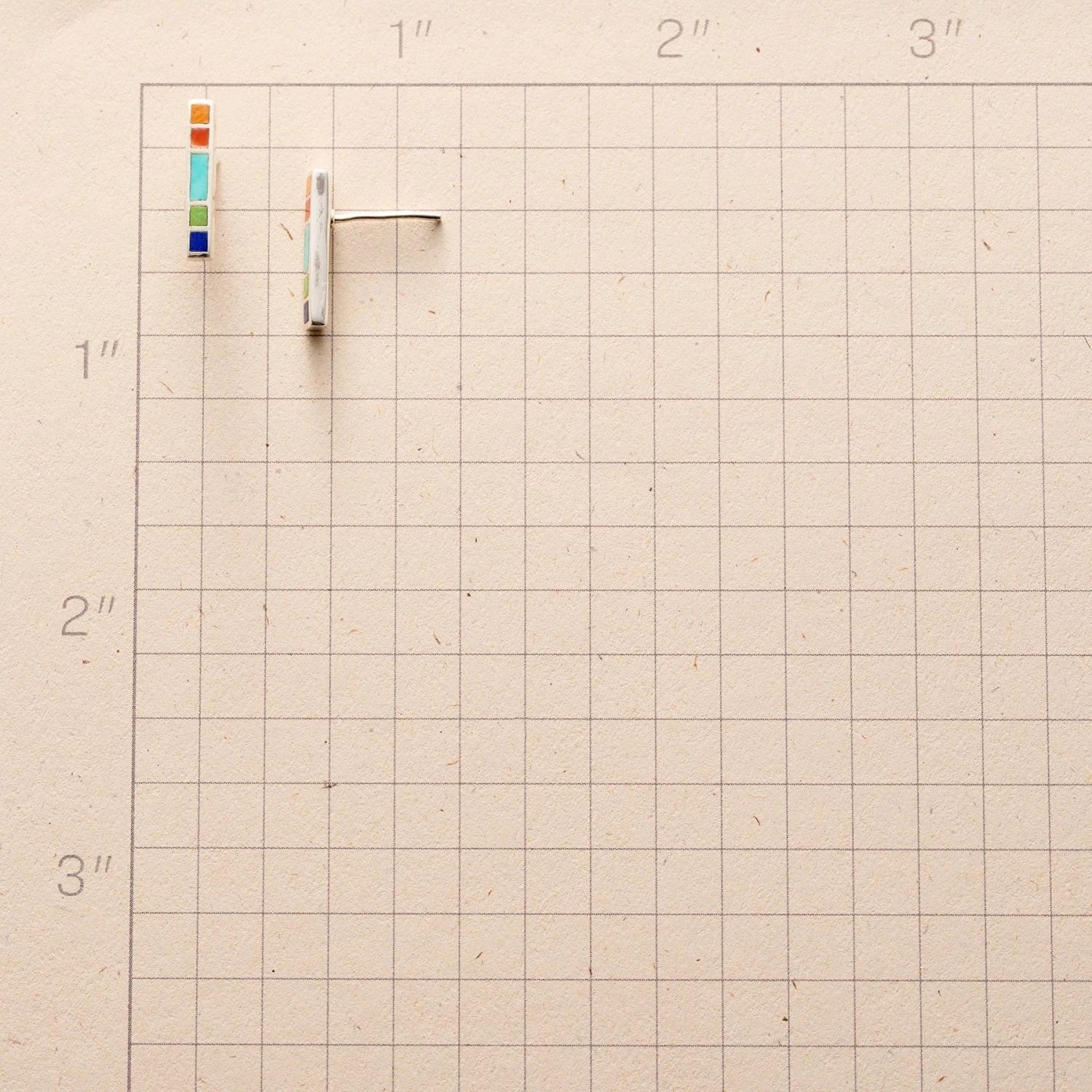 Expertly inlaid spiny oyster shell, coral, turquoise, gaspeite and lapis promenade down petite sterling silver bars. Posts. Handcrafted. Exclusive. 5/8″L.