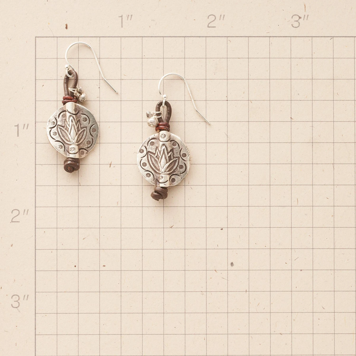 Hill tribe artisans endow Thai silver disks with the mark of the lotus, symbol of rebirth and resilience. Leather runs through the center, knotted and looped to sterling silver French wires. Handcrafted in USA. Exclusive. 1-1/2″L.