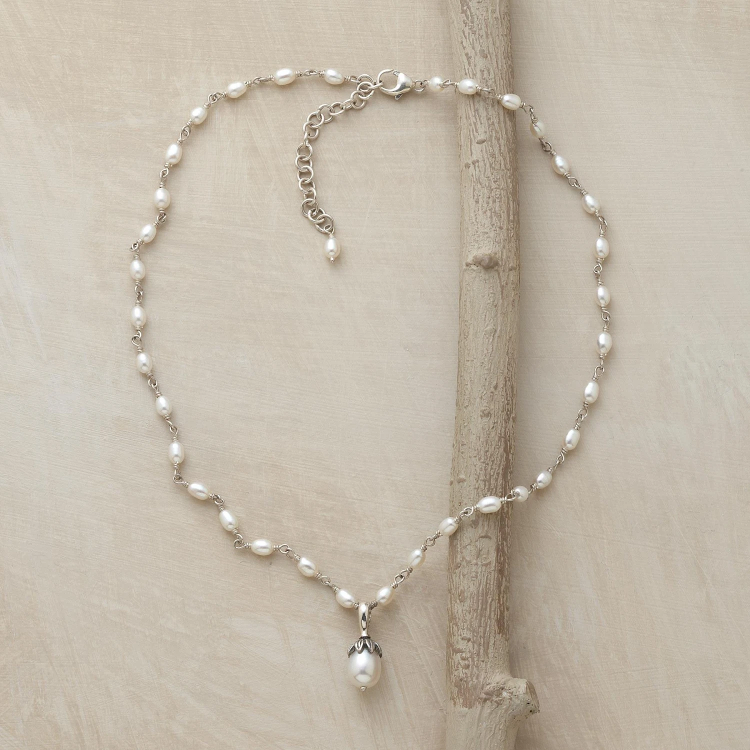 Sterling silver lotus flowers appears in bloom, the blossoms formed of a lustrous white pearl. A trail of seed pearls linked with twisted sterling silver wire and a lobster clasp. Handcrafted with cultured pearls. 15-3/4″ to 17-3/4″L.