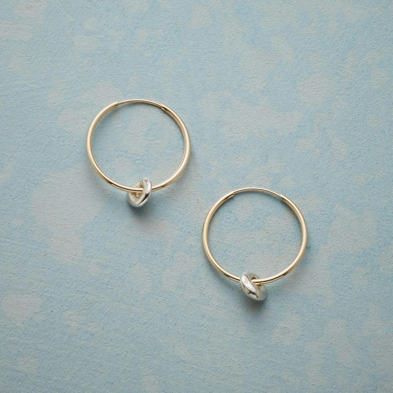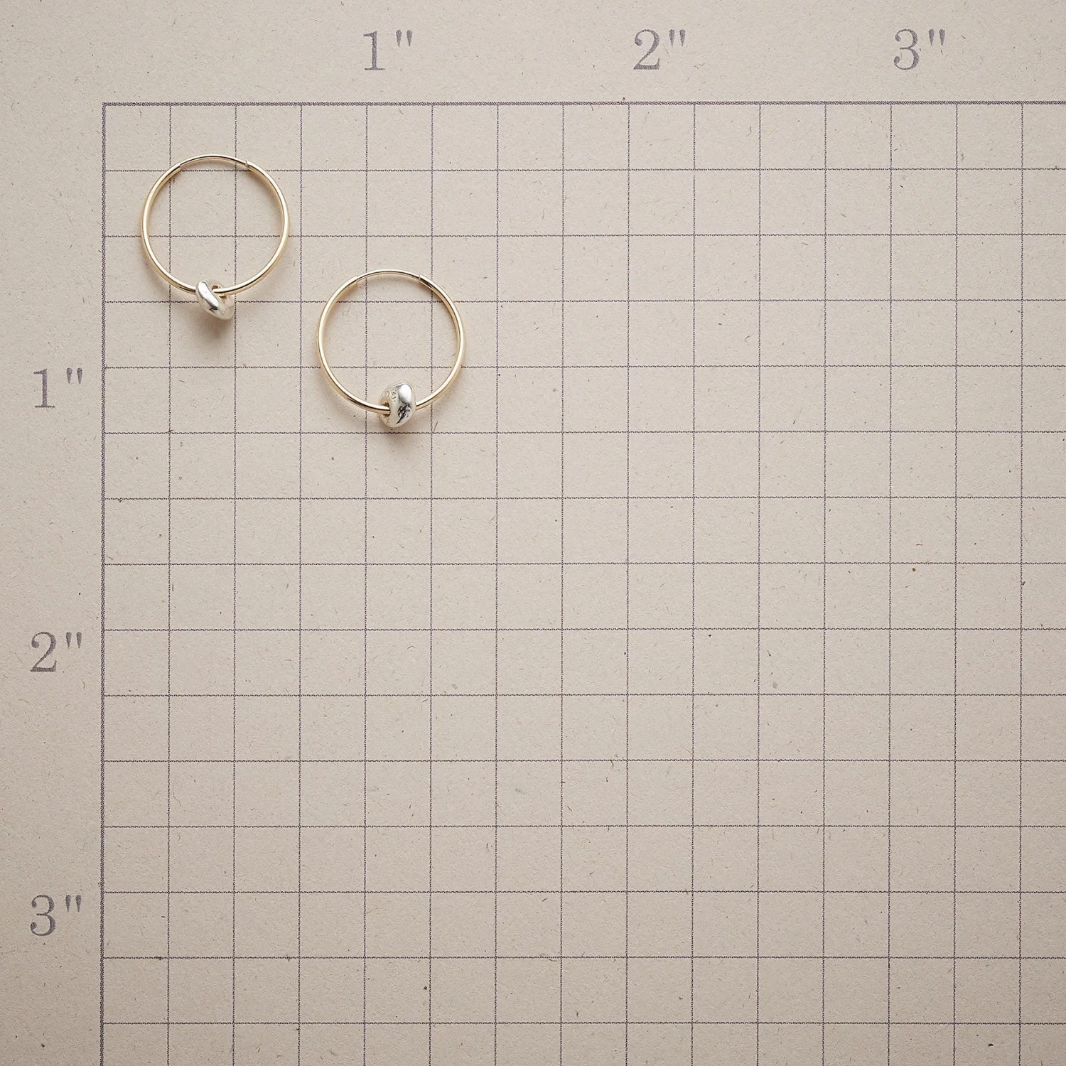 Sterling silver pebbles slip onto hoops of 10kt gold self-locking hoops. Handcrafted. Exclusive. Approx. 1/2″ dia.