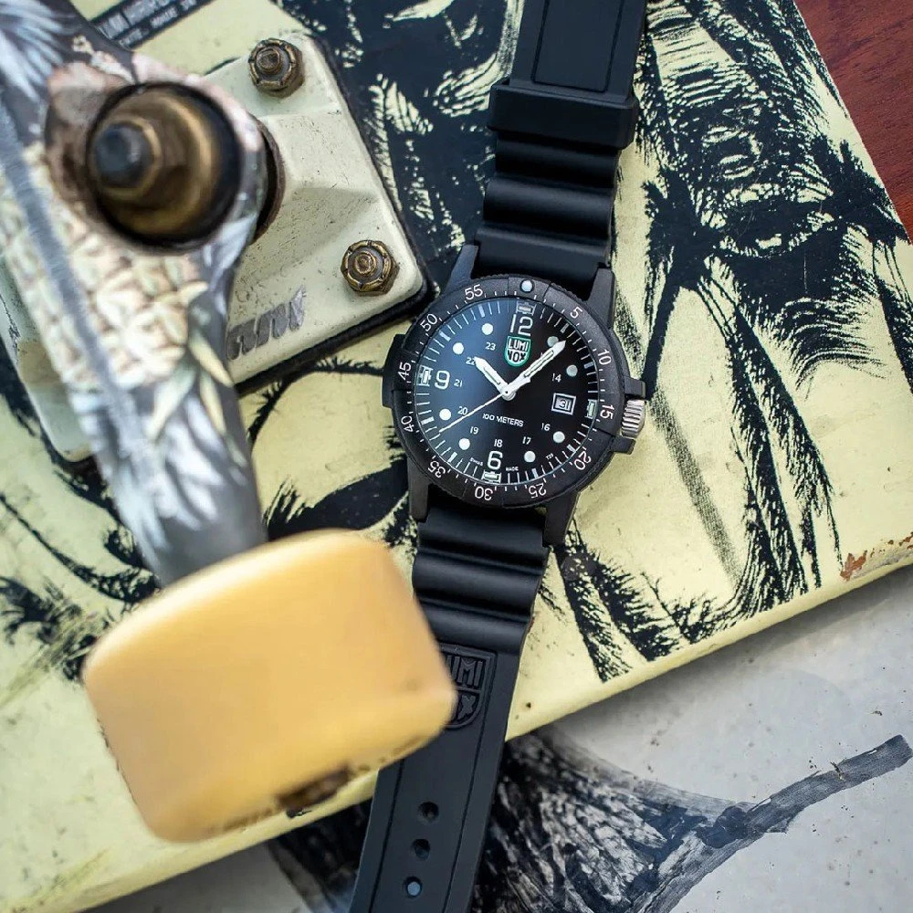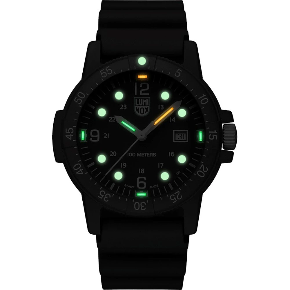This Luminox watch has a case made of carbon with a diameter of 44 mm and is fitted with a rubber band. Inside the case lies a Ronda movement and the watch features a Mineral crystal.