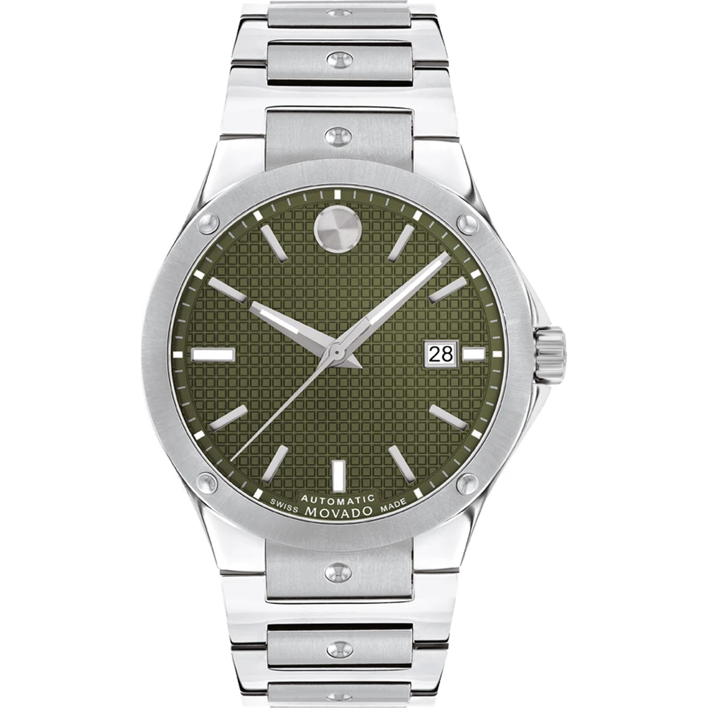 This Movado watch has a case made of stainless steel with a diameter of 41 mm and is fitted with a metal band. Inside the case lies a Sellita movement and the watch features a Sapphire crystal.