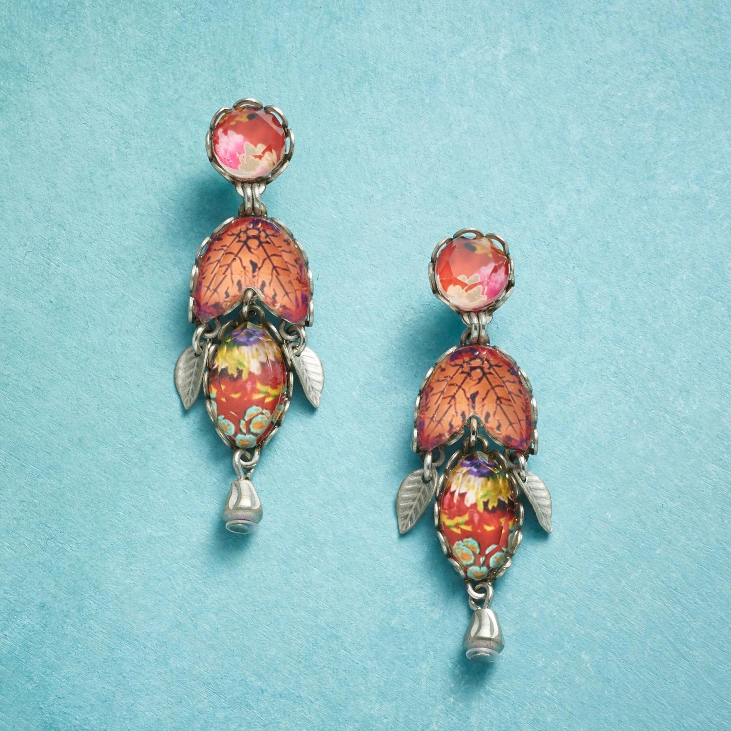 Faceted crystals refract tropical patterns into three tiers of color and light. Silver-plated leaves and raindrops dangle and dance. Posts. Handcrafted. Exclusive. 1-5/8″L.