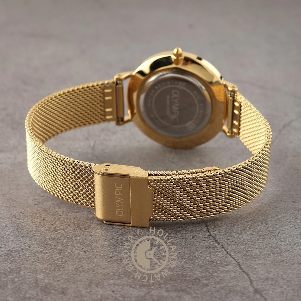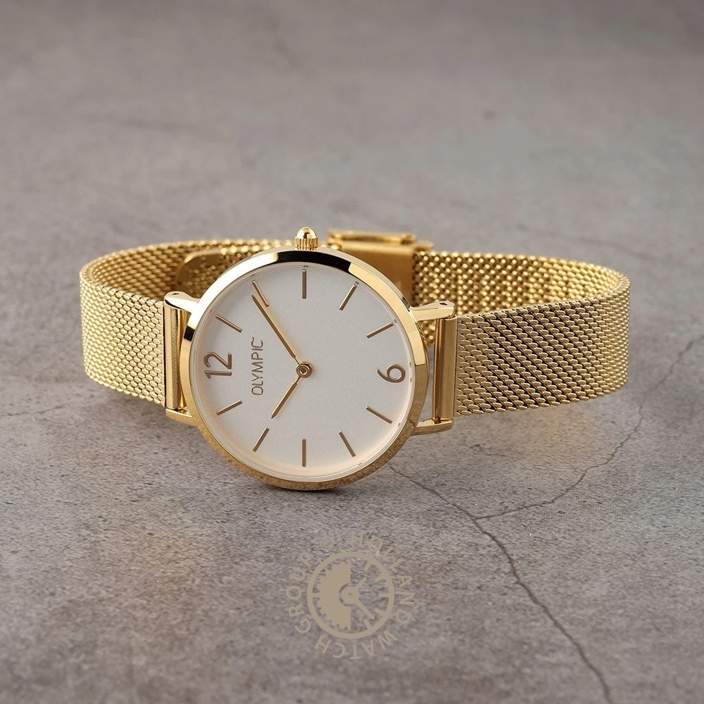 This Olympic watch has a case made of stainless steel with a diameter of 32 mm and is fitted with a metal band. Inside the case lies a Miyota movement and the watch features a Mineral crystal.
