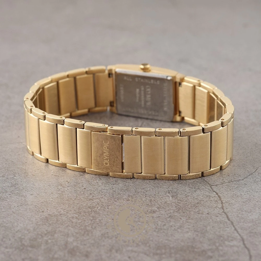This Olympic watch has a case made of stainless steel with a diameter of 19 mm and is fitted with a metal band. Inside the case lies a Seiko movement and the watch features a Mineral crystal.