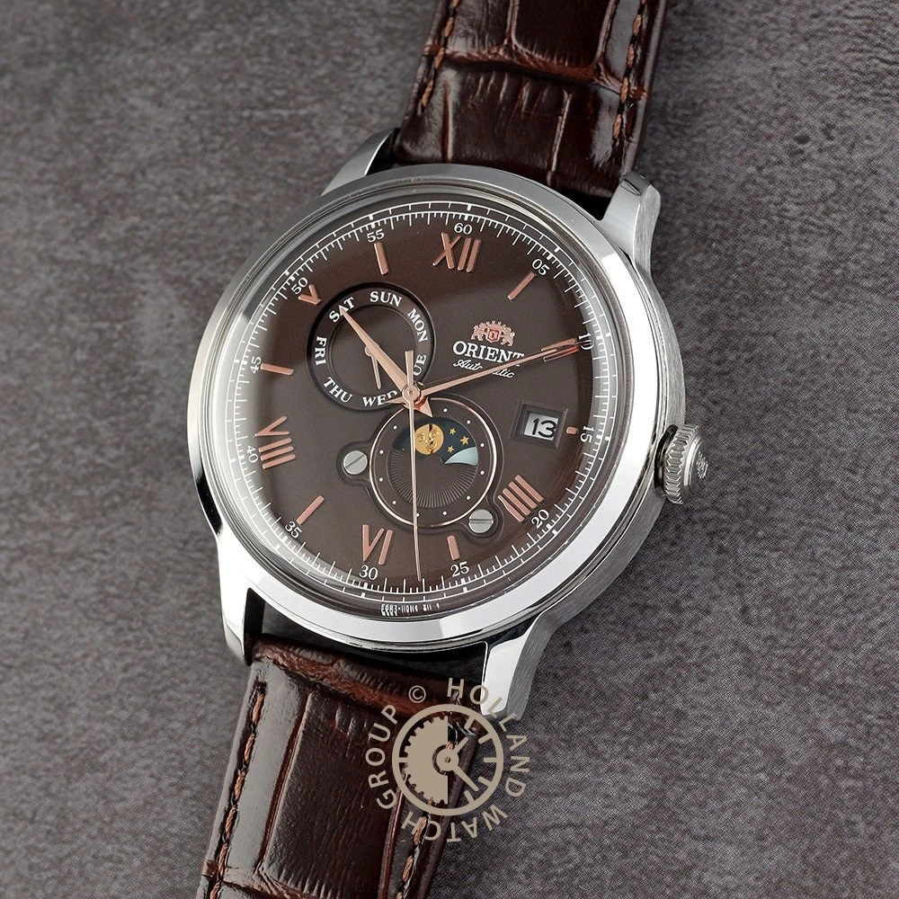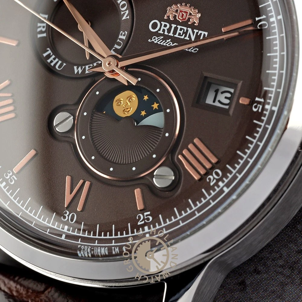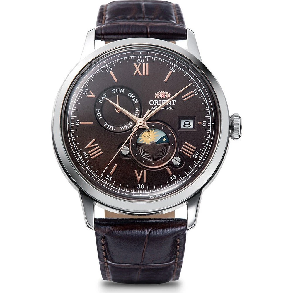 This Orient watch has a case made of stainless steel with a diameter of 41.5 mm and is fitted with a leather band. Inside the case lies a Seiko Instruments Inc. movement and the watch features a Mineral crystal.