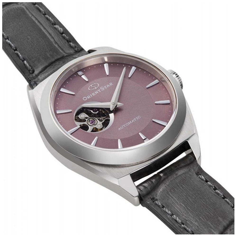 This Orient watch has a case made of stainless steel with a diameter of 30 mm and is fitted with a leather band. Inside the case lies a Orient movement and the watch features a Sapphire crystal.