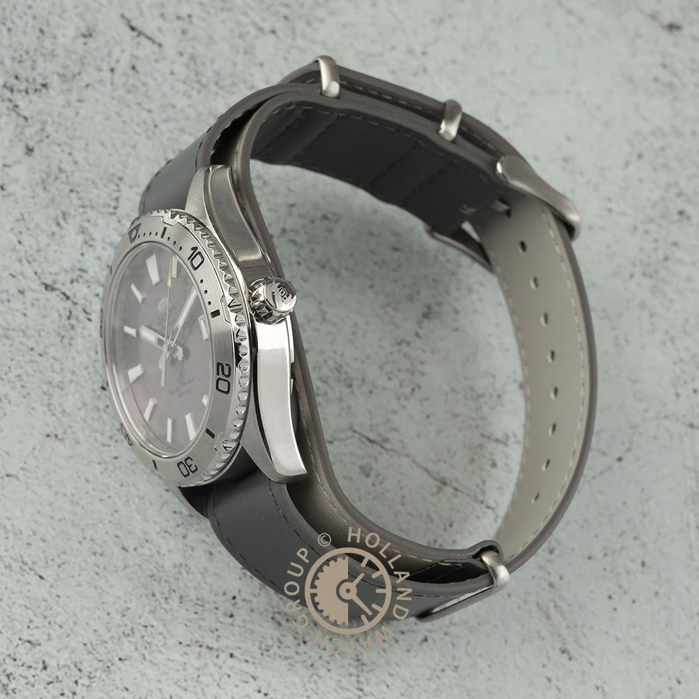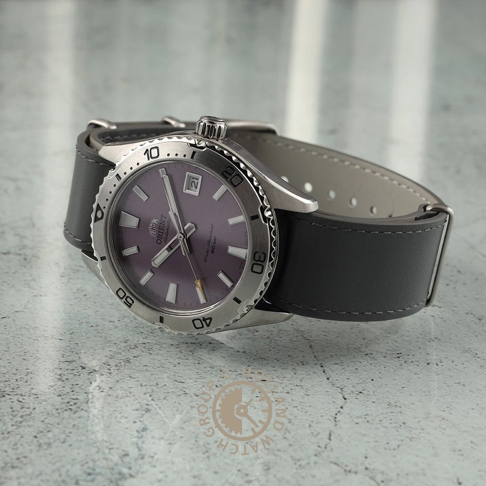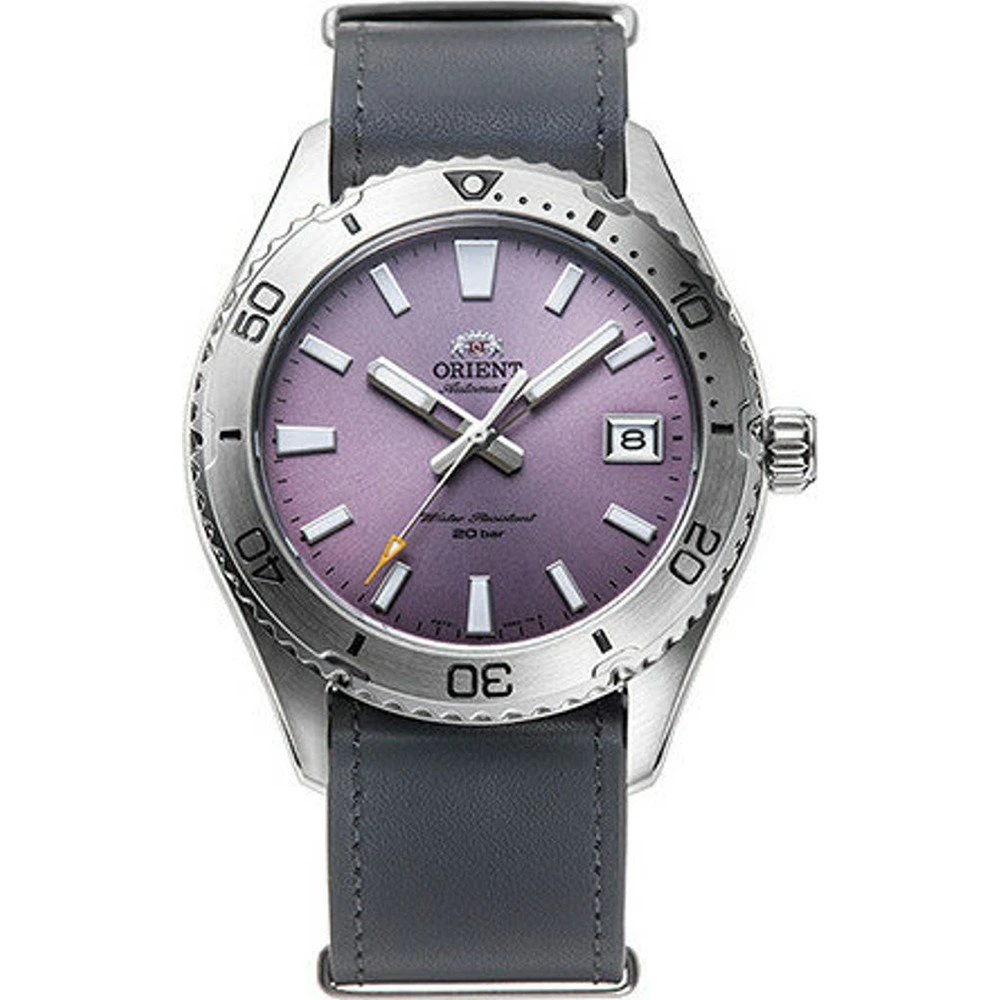 This Orient watch has a stainless steel case 40 mm in diameter and is fitted with a leather strap. Inside the case lies a Orient movement and the watch features a Mineral crystal.