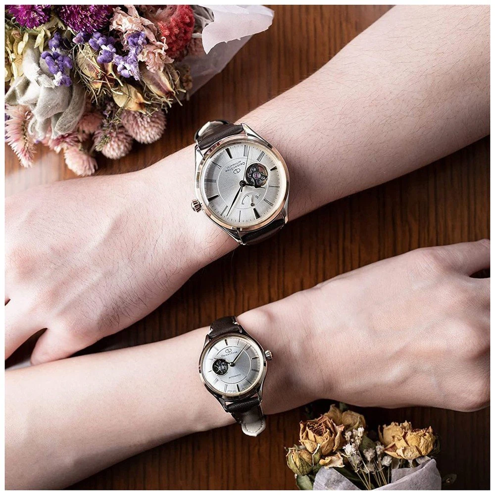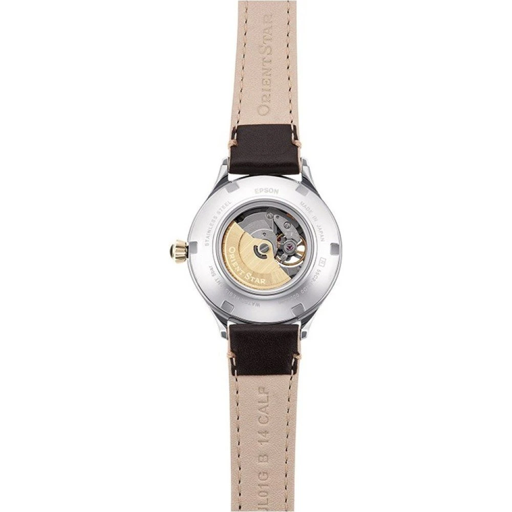 This Orient watch has a case made of stainless steel with a diameter of 30 mm and is fitted with a leather band. Inside the case lies a Orient movement and the watch features a Sapphire crystal.