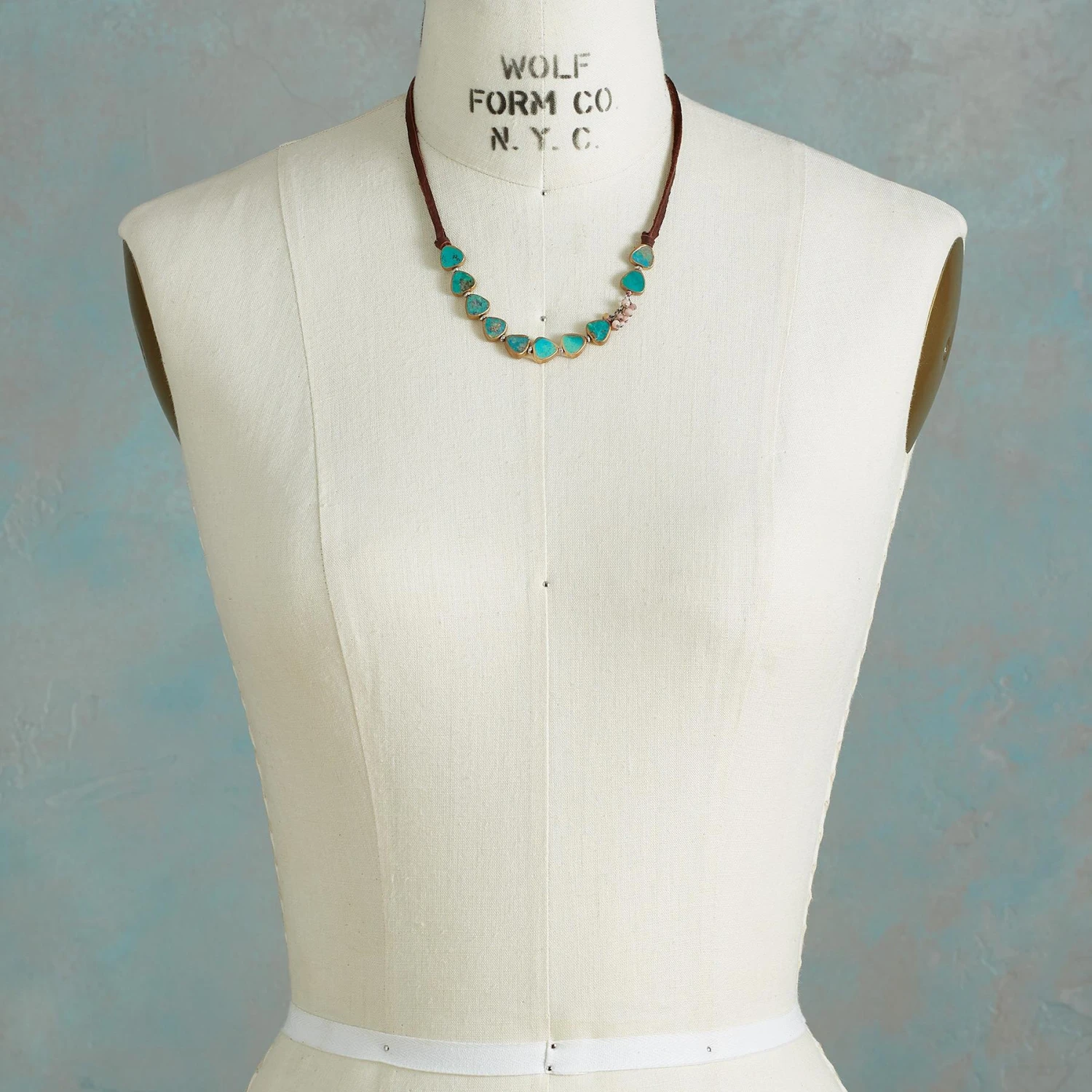 Strung from soft leather, triangles of copper-wrapped turquoise lead the way to a burst of pink opal and rhodochrosite. Sterling silver lotus flower clasp. Handcrafted. Exclusive. 18″L.