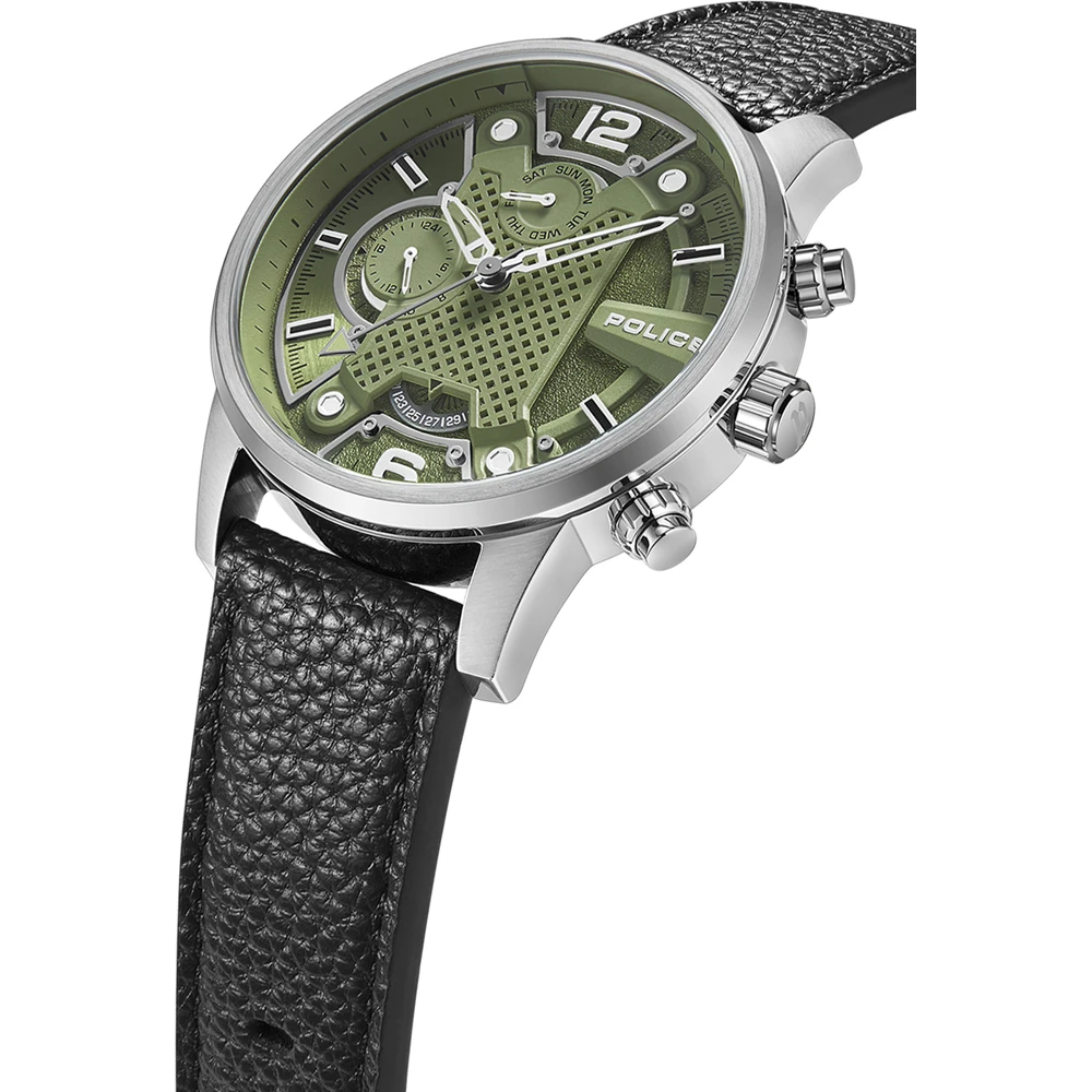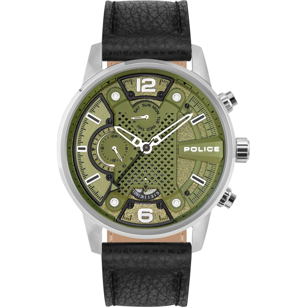 This Police watch has a case made of stainless steel with a diameter of 48 mm and is fitted with a leather band. Inside the case lies a Seiko Instruments Inc. movement and the watch features a Mineral crystal.