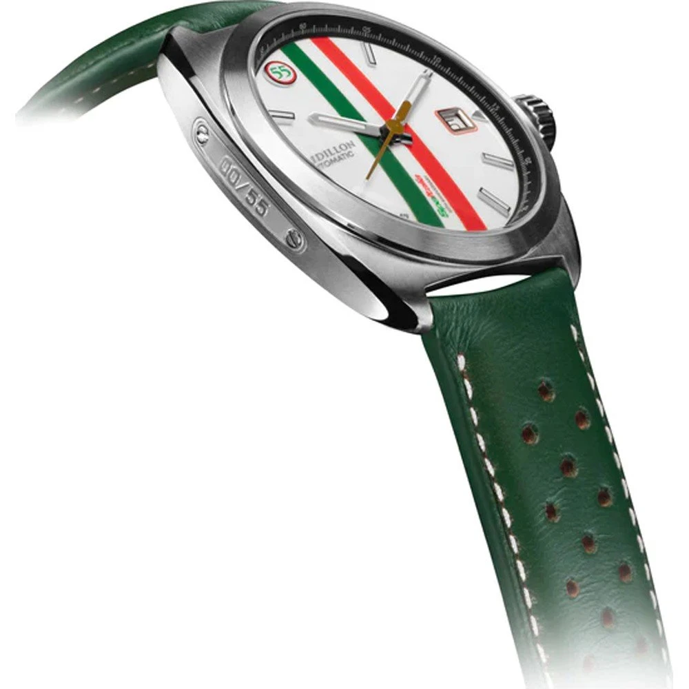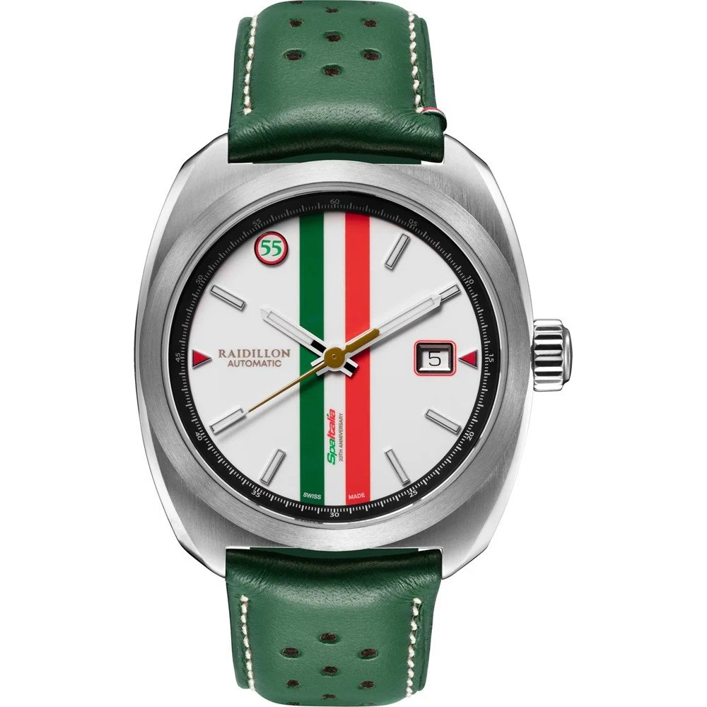 This Raidillon watch has a case made of stainless steel with a diameter of 41 mm and is fitted with a leather band. Inside the case lies a Sellita movement and the watch features a Double anti-reflective sapphire crystal crystal.