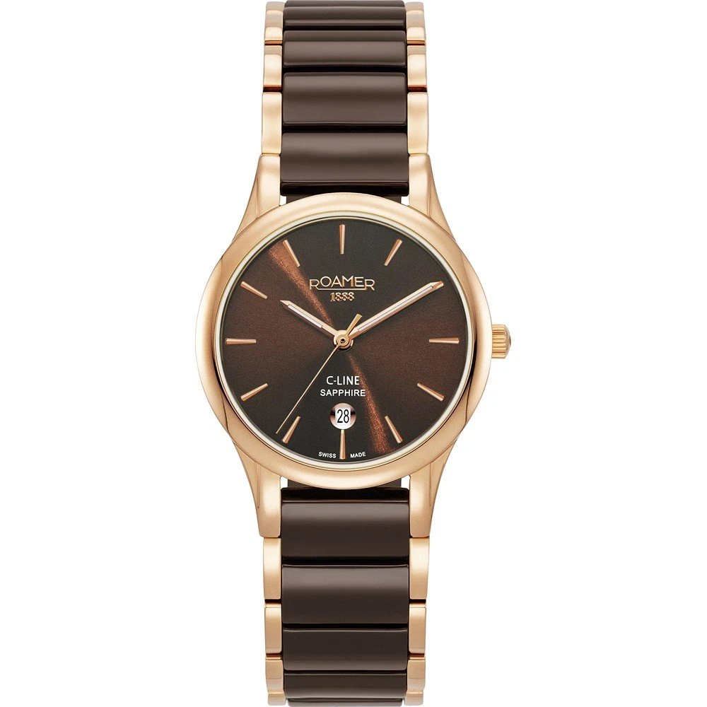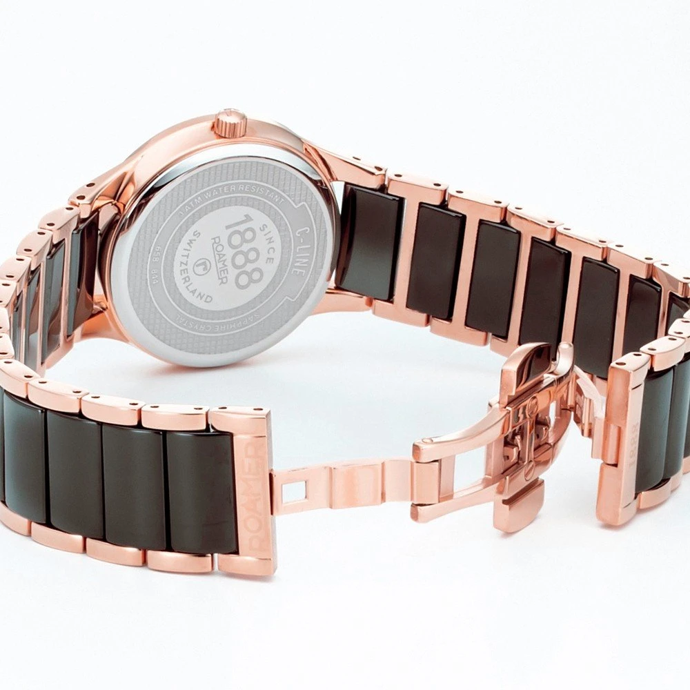This Roamer watch has a case made of stainless steel with a diameter of 30 mm and is fitted with a ceramic band. Inside the case lies a Ronda movement and the watch features a Sapphire crystal.