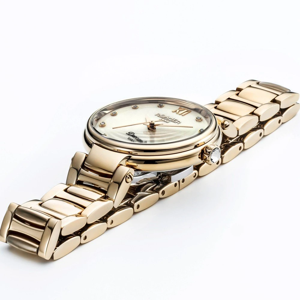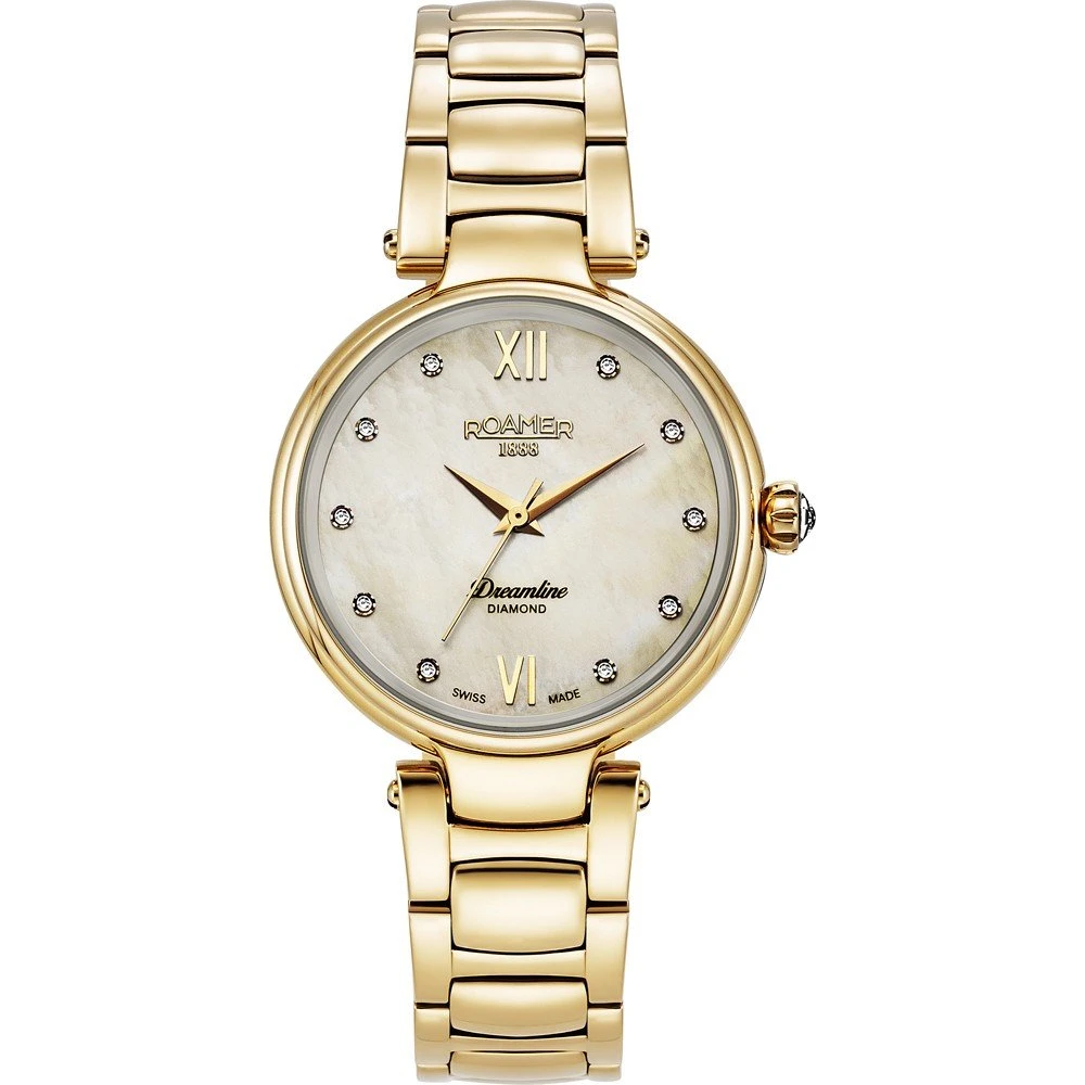 This Roamer watch has a case made of stainless steel with a diameter of 33 mm and is fitted with a metal band. Inside the case lies a Ronda movement and the watch features a Sapphire crystal.