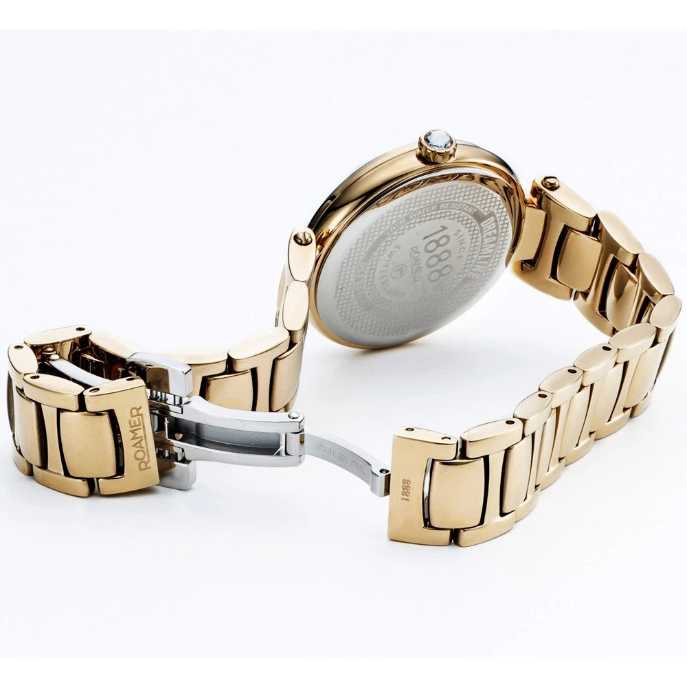The watch is 5 ATM. This means the watch is suitable for showering. The watch comes with Roamer 2+5.