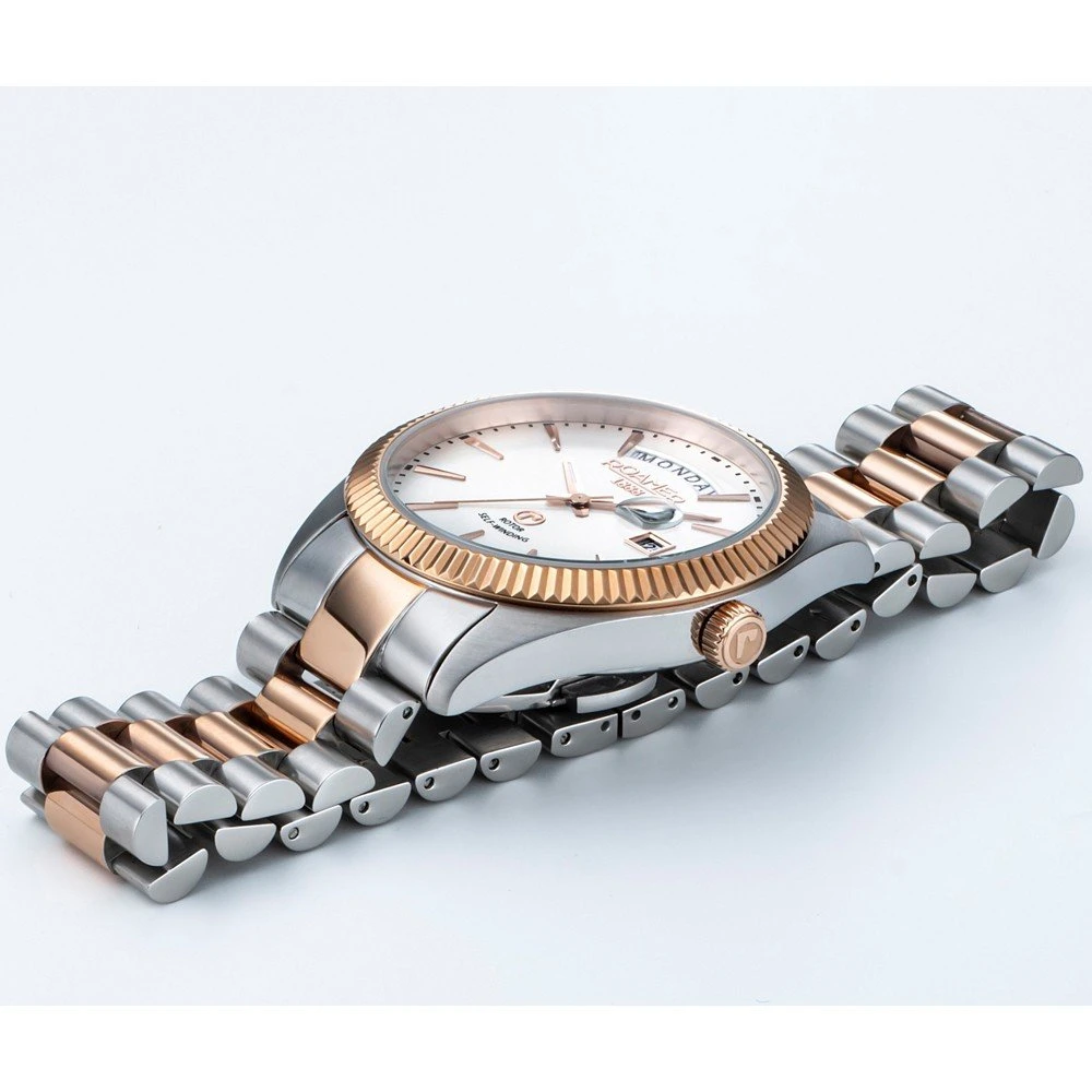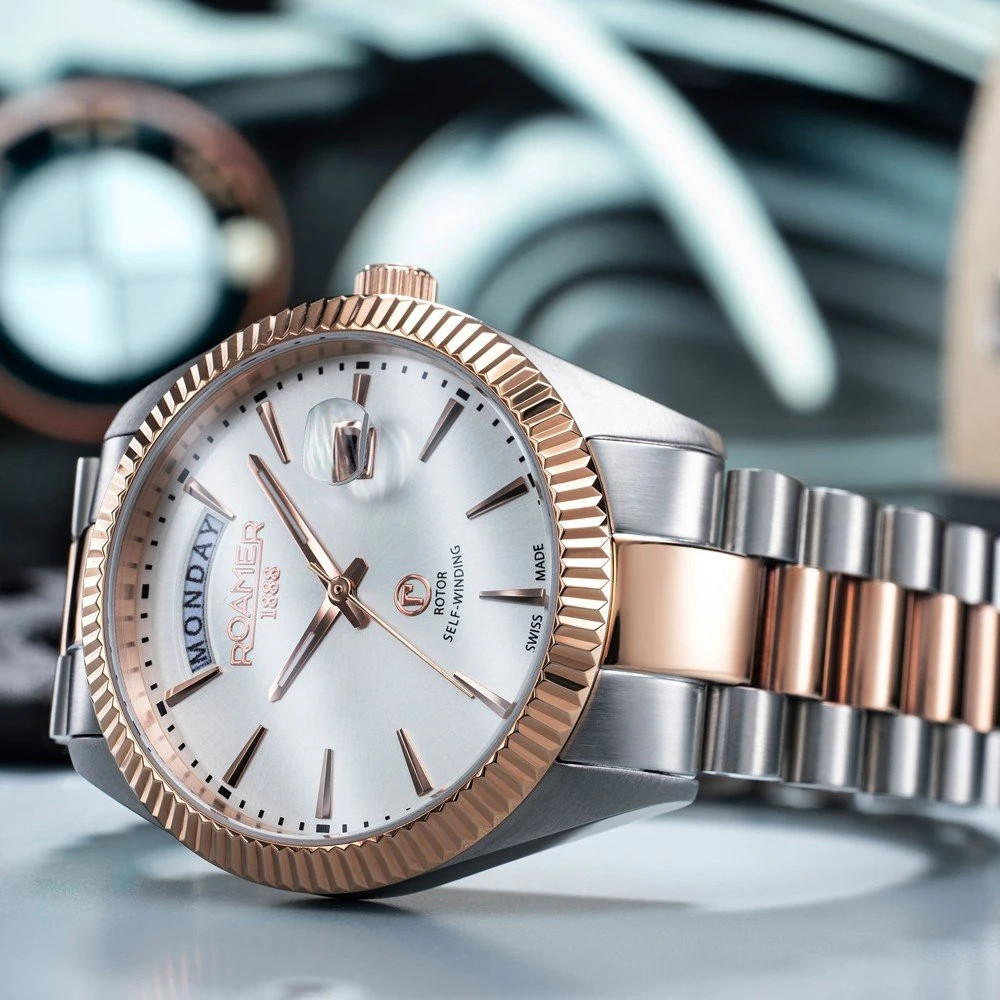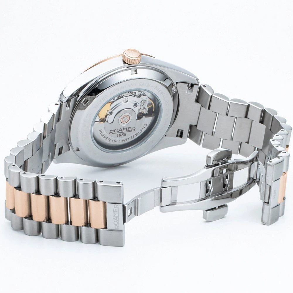 The watch is 5 ATM. This means the watch is suitable for showering. The watch comes with Roamer 2+5.