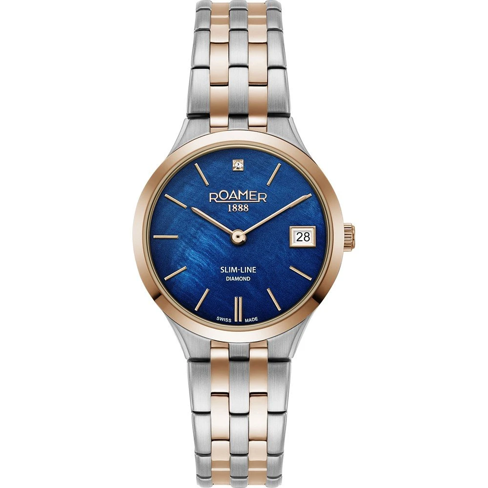 This Roamer watch has a case made of stainless steel with a diameter of 30 mm and is fitted with a metal band. Inside the case lies a Ronda movement and the watch features a Single anti-reflective sapphire crystal.
