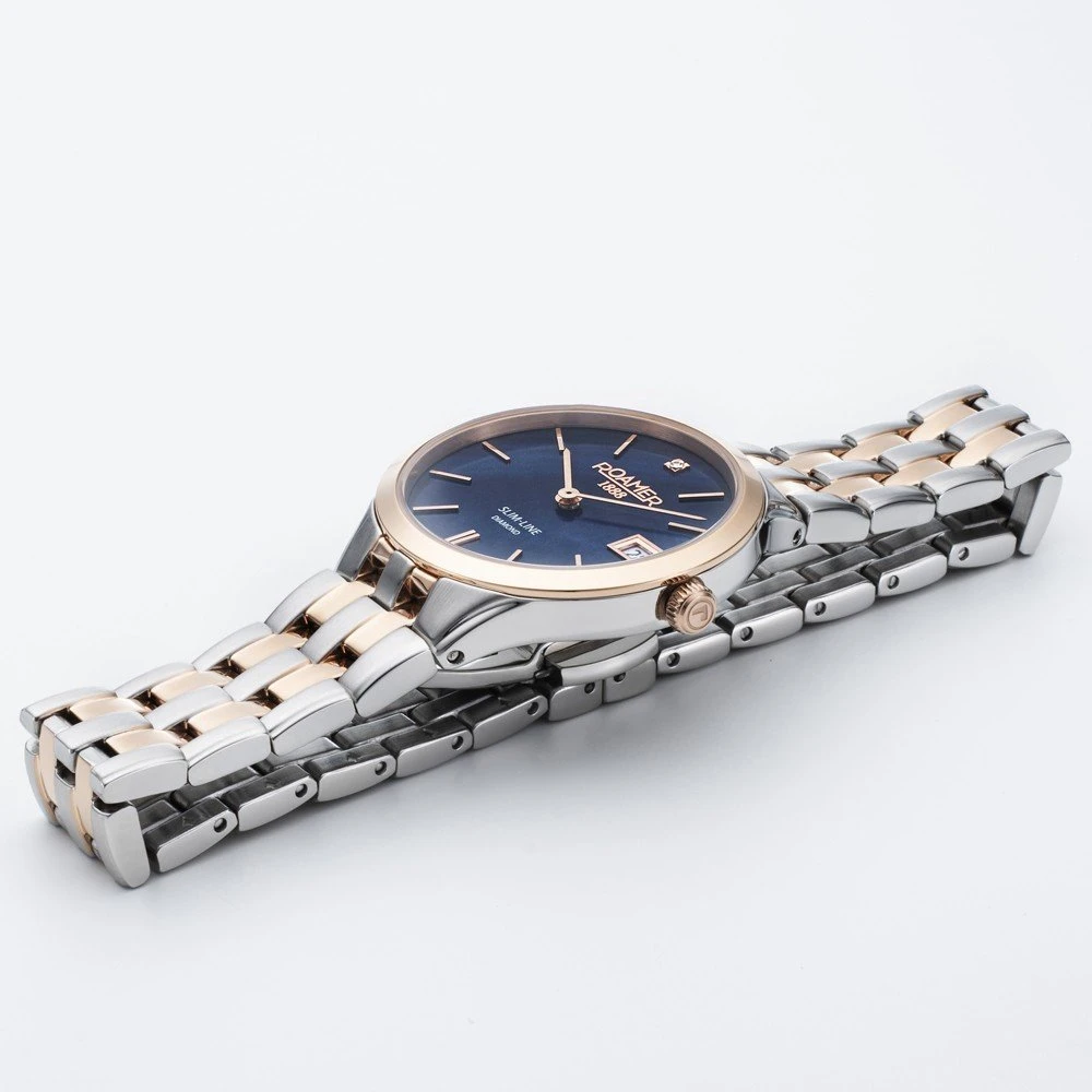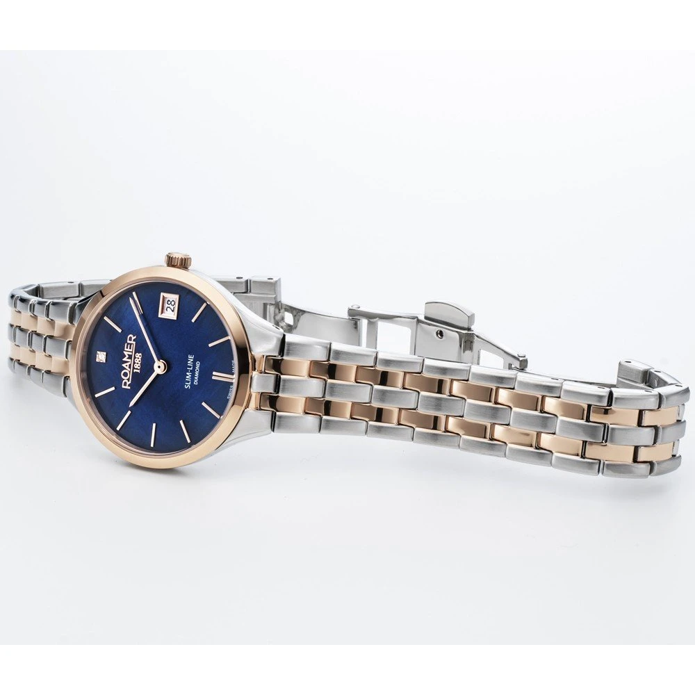 The watch is 5 ATM. This means the watch is suitable for showering. The watch comes with Roamer 2+5.