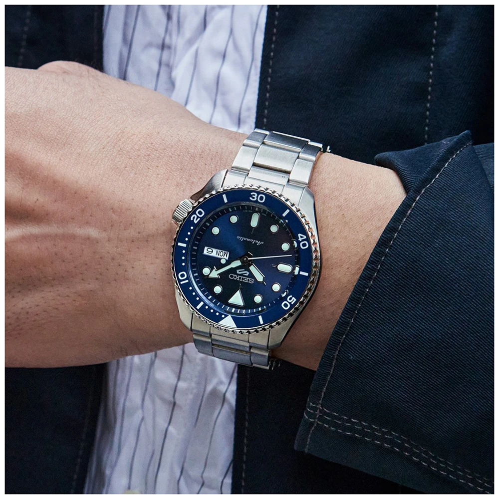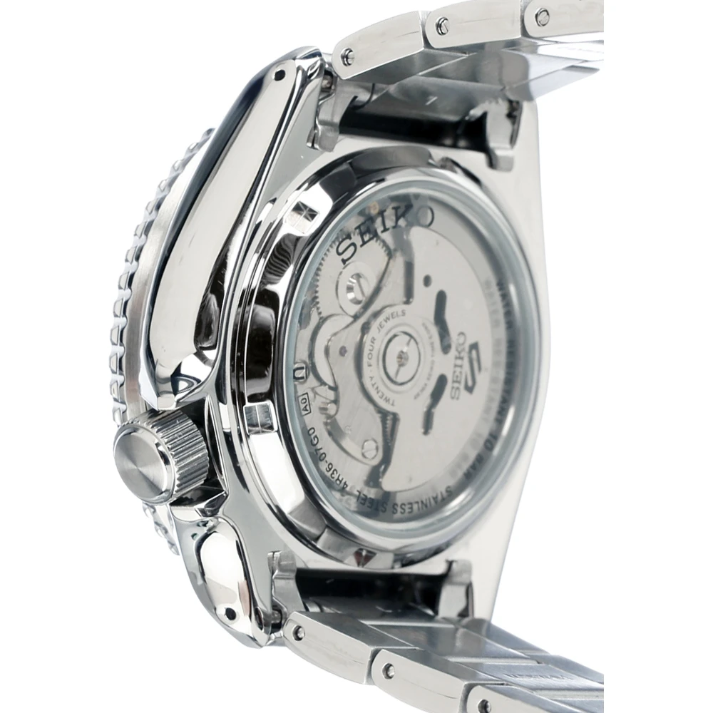 This Seiko watch has a case made of stainless steel with a diameter of 42.5 mm and is fitted with a metal band. Inside the case lies a Seiko movement and the watch features a Mineral crystal.