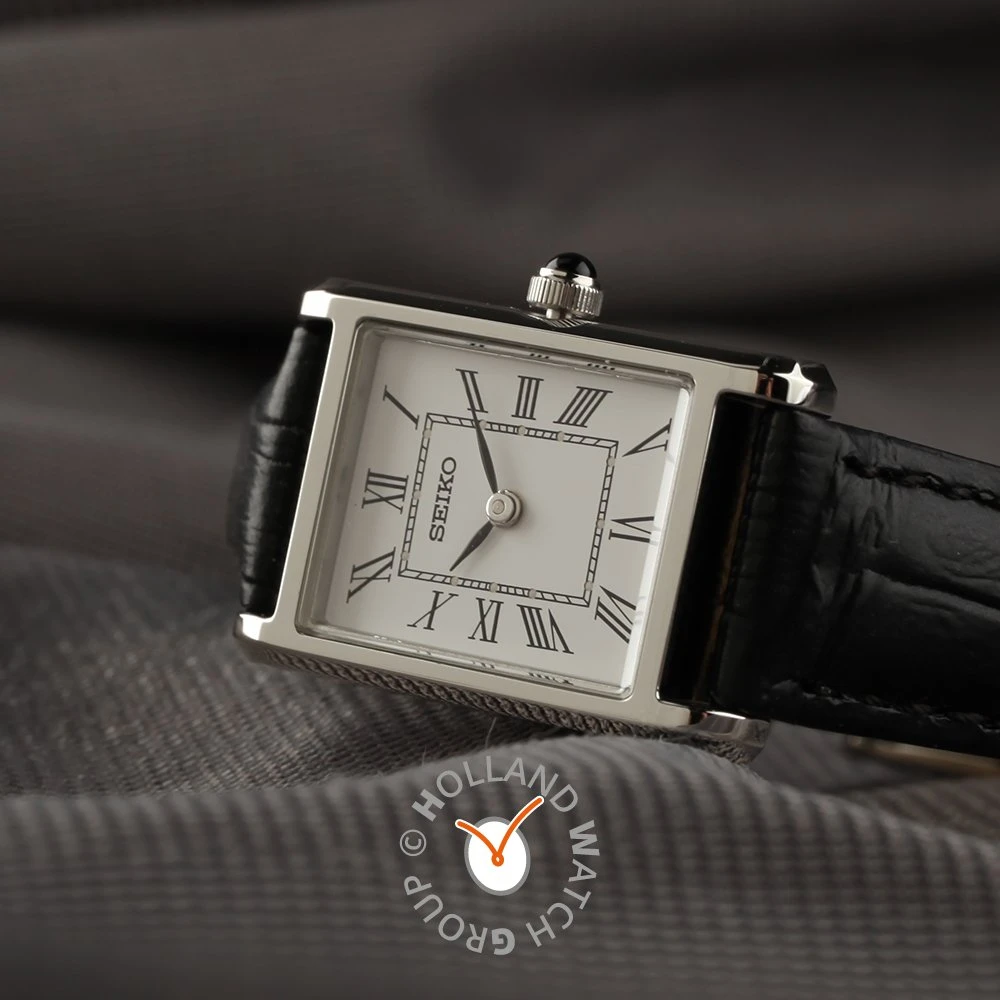 This Seiko watch has a case made of stainless steel with a diameter of 19 mm and is fitted with a leather band. Inside the case lies a Seiko movement and the watch features a Hardlex crystal crystal.