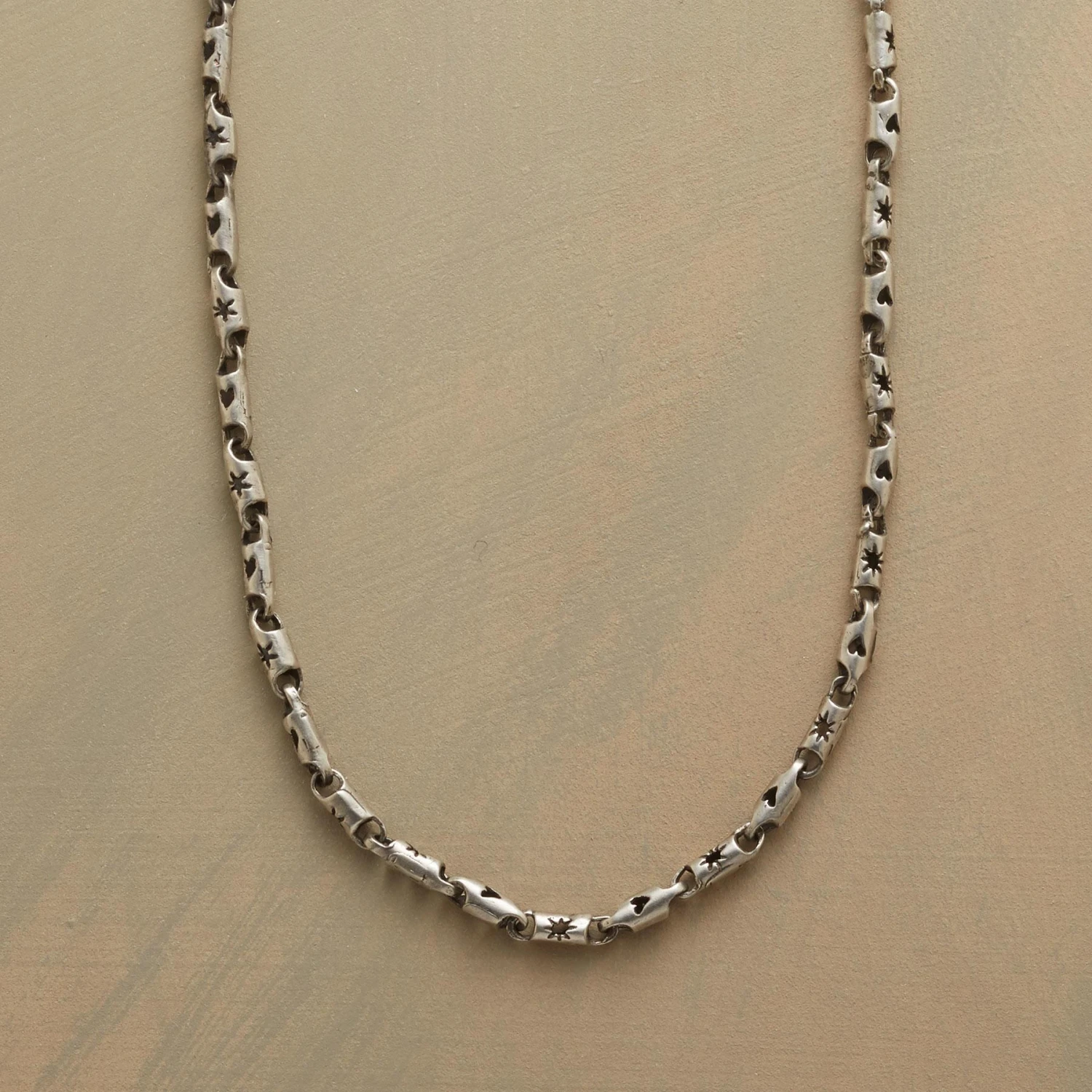 Jes MaHarry’s cutout stars and hearts adorn sterling silver links. Wear on its own or customize with charms. Lobster clasp. Handcrafted in USA. 29″L. Charms sold separately.