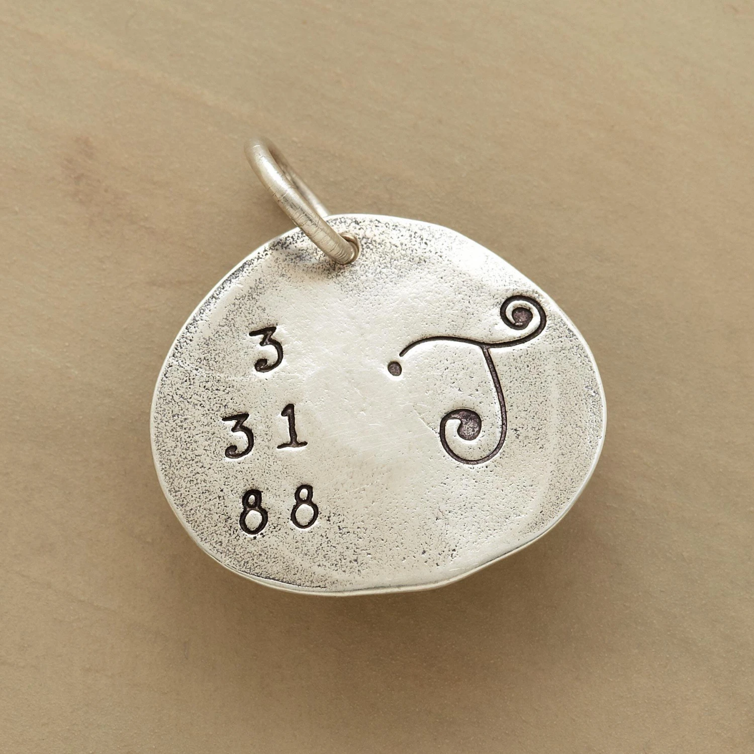 Jes MaHarry’s sterling silver charm is engraved with date and one initial; stamped heart on reverse. 1″L.