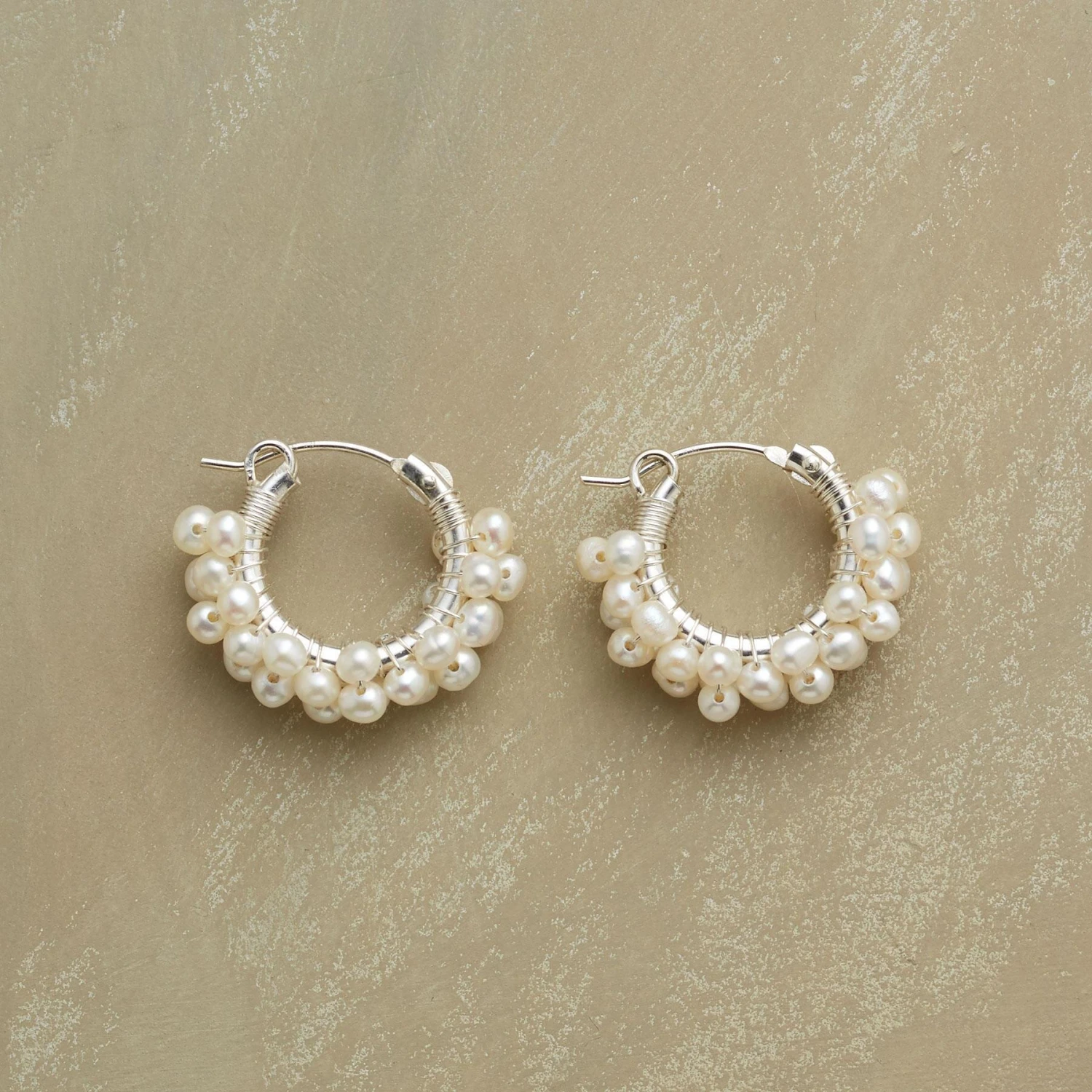 A pair of wired hoop earrings, with little cultured pearls enveloping sterling silver hoops in a luminous froth. The gems are wired by hand; the earrings finished with snap down wires. Made in USA. 5/8″L.